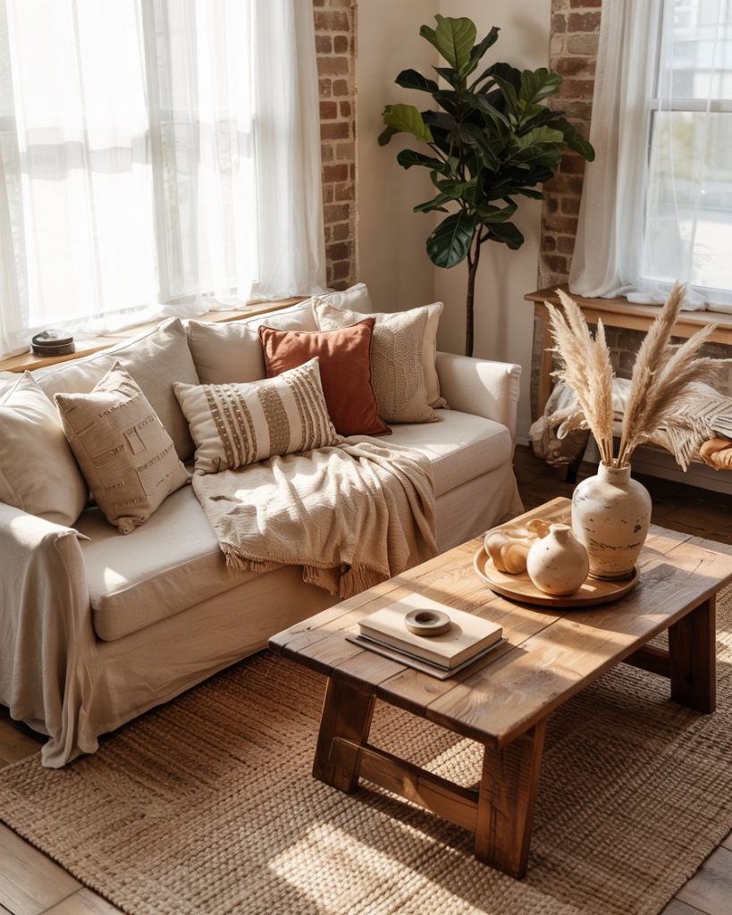 This look combines Scandi simplicity with boho warmth—pale woods, neutral fabrics, and cozy woven throws. It’s perfect for those who love minimalist order yet crave texture. A Stockholm apartment I once toured had white walls layered with beige textiles—it was both peaceful and personal.