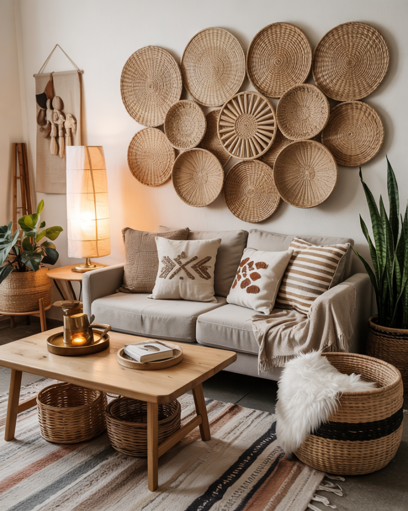 This take is grounded in earthy tones—terracottas, moss greens, and natural woods—with influences from African and Afro-inspired patterning and robust basket walls. It’s a layered, soulful environment that evokes travel and cultural richness. I visited a home where a gallery of woven baskets spanned an entire wall, mixed with tribal prints and warm lighting, creating a cozy yet worldly lounge.