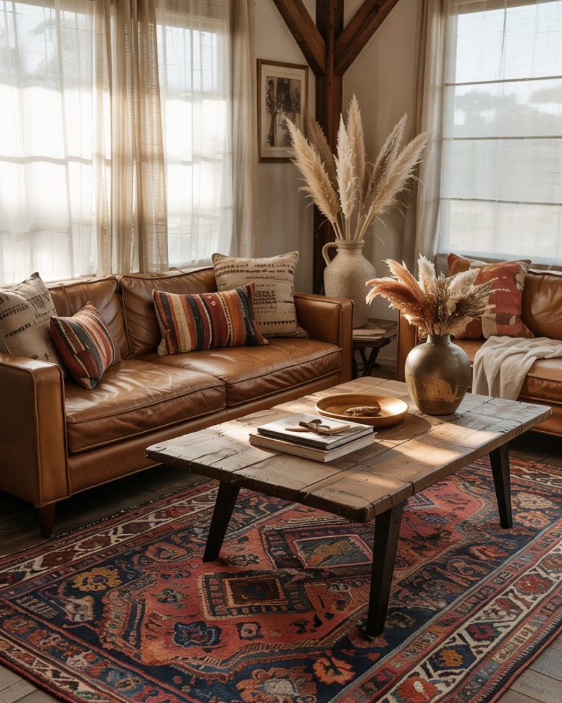 Picture a laid-back boho space infused with Western motifs: leather chairs, woven textiles, a weathered wood coffee table, and rustic accents combined with boho softness and patterns. I once stayed in a desert home where the designer blended cowboy-style elements—like a wool patterned rug and vintage saddlebag decor—with boho plants and textiles for a relaxed but distinctive look.