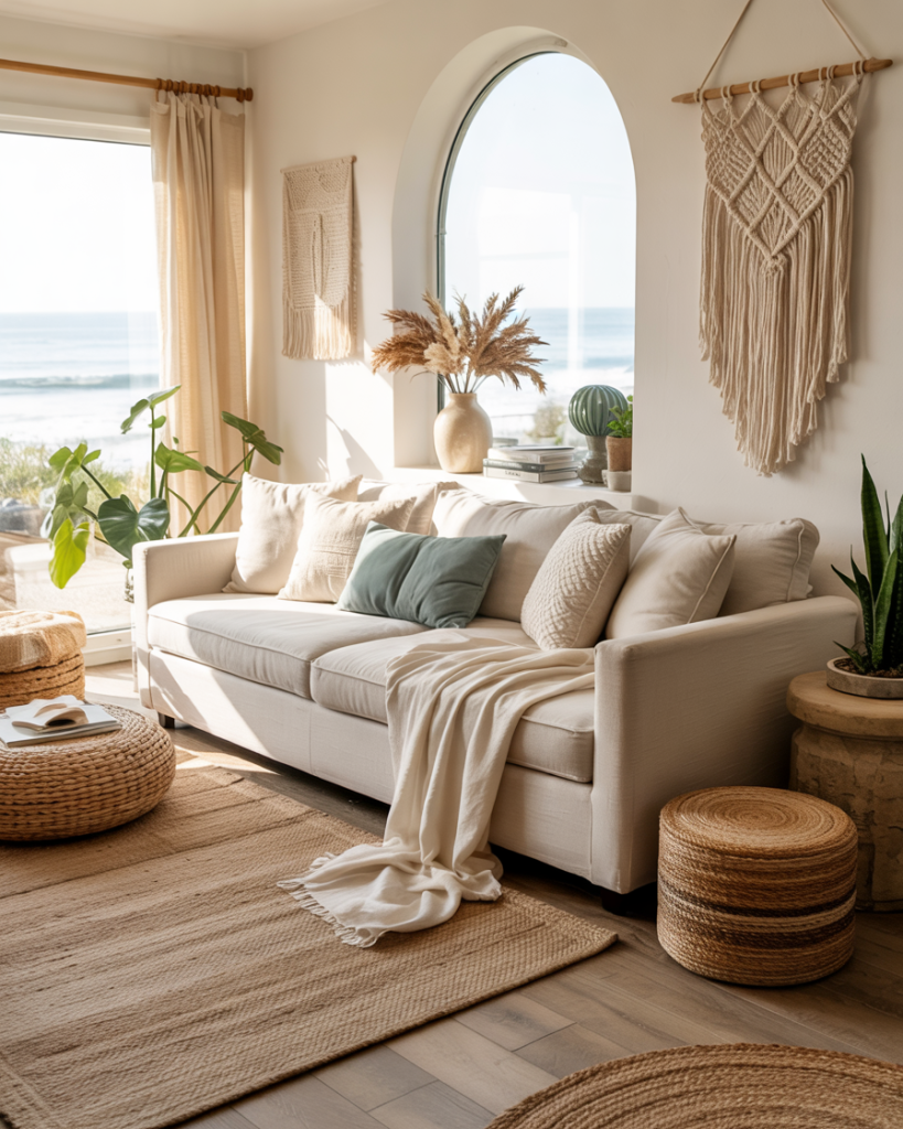 Here we combine Scandi minimalism and calm with boho comfort and a coastal vibe. Light woods, soft green and blue tones, airy textures, and woven decor create a tranquil space. On a coastal house project, we used pale oak floors, linen upholstery, and macramé wall hangings for a bright boho-coastal harmony that felt peaceful yet stylish.