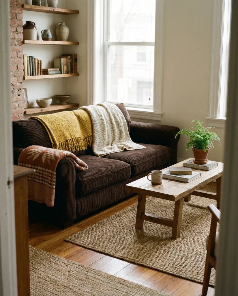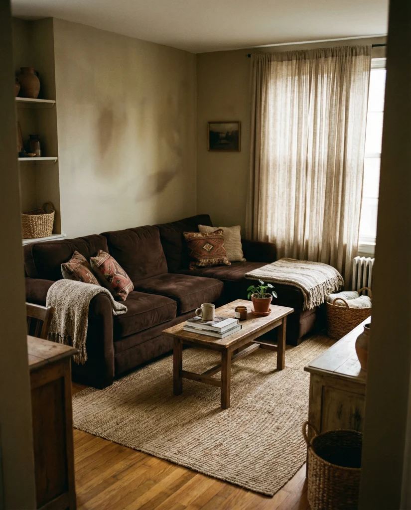 A dark chocolate or espresso brown couch creates an instantly cozy environment, especially when layered with soft throws and warm lighting. Many people living in apartments appreciate how this style brings comfort without feeling heavy. Mixing textures, natural fibers, and flexible lighting makes the room feel calm and inviting after a long day.