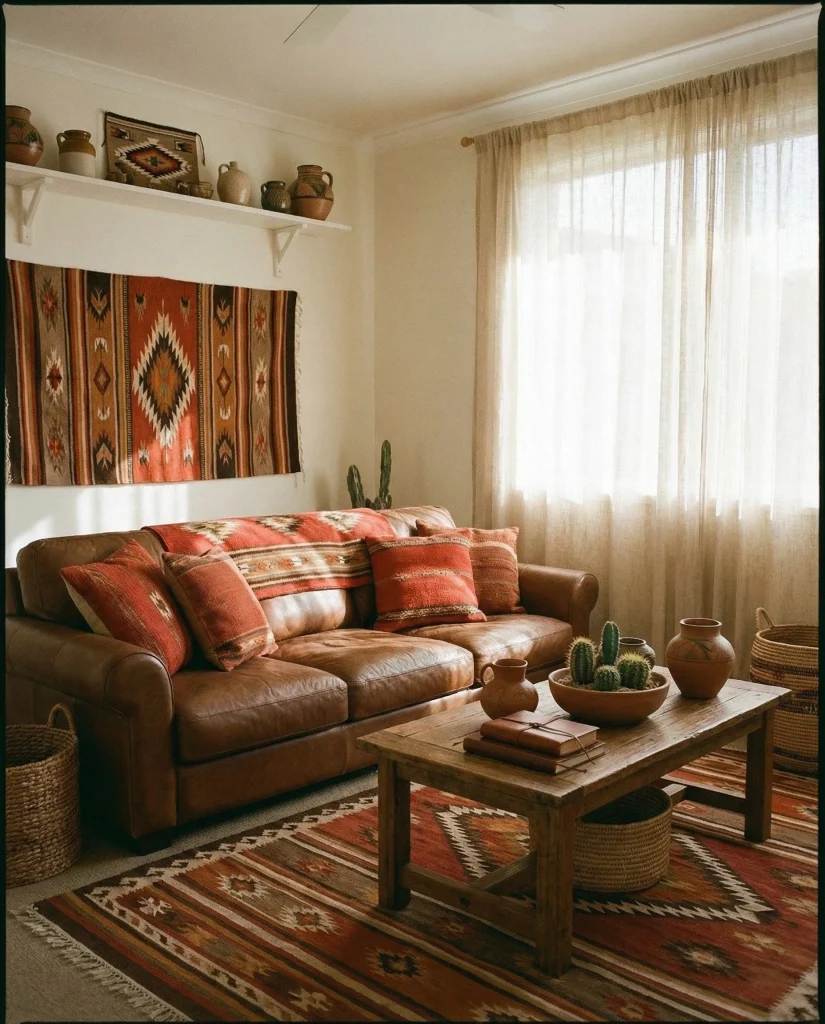 A brown couch looks striking with red, orange, or rust accents, creating a bold yet welcoming palette. This idea appears in Southwestern-inspired spaces where warm tones feel energizing without overwhelming daily life. The combination adds personality and makes the room feel lively and memorable.