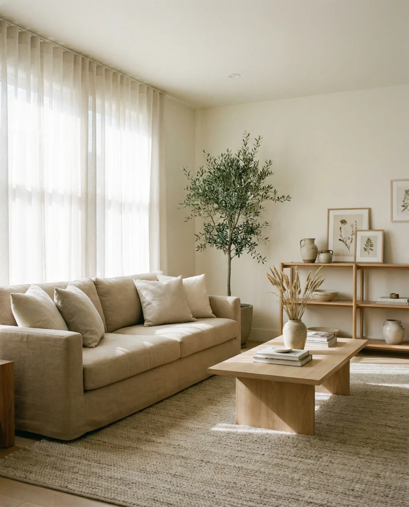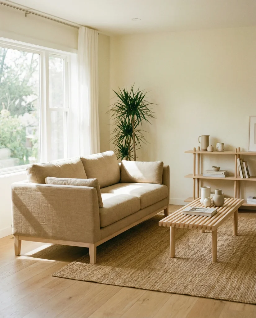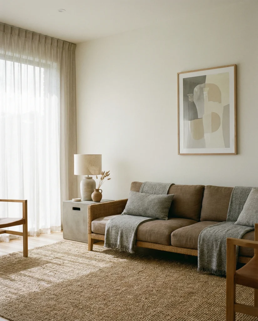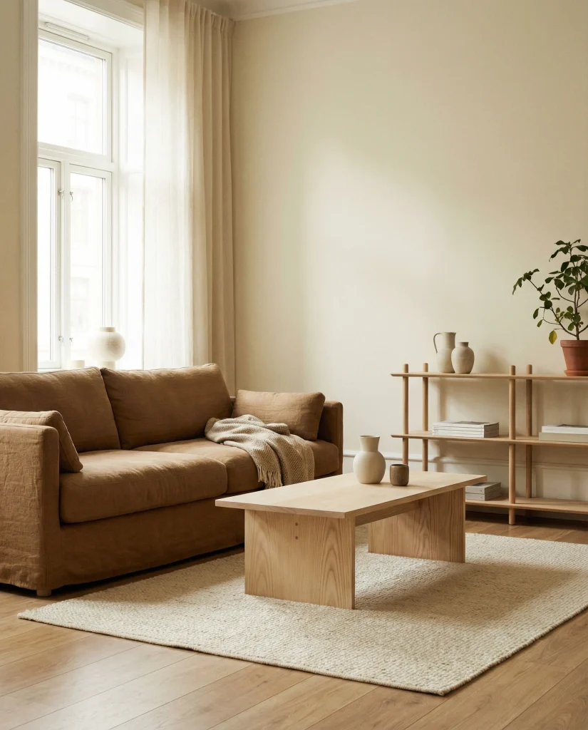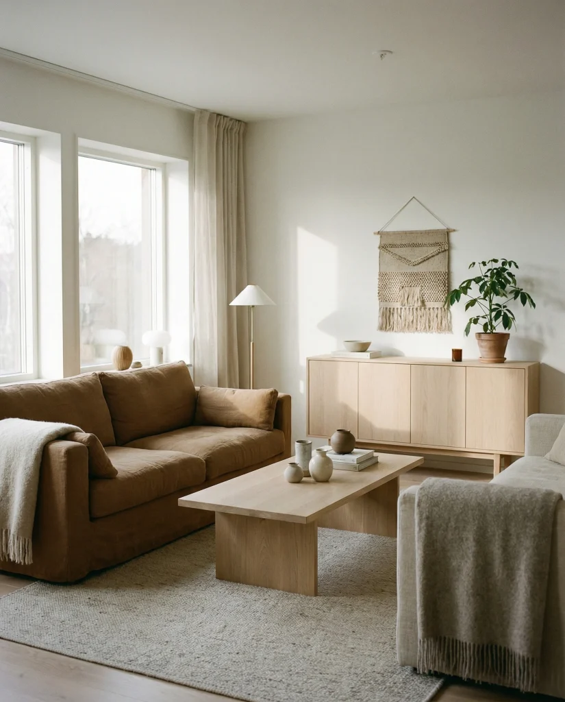 A light or tan brown couch works beautifully in modern spaces, giving the room warmth without sacrificing openness. This look often appears in minimalist homes that use pale woods, gentle neutrals, and simple shapes. It suits people seeking a peaceful environment that still feels lived-in and welcoming rather than overly strict.