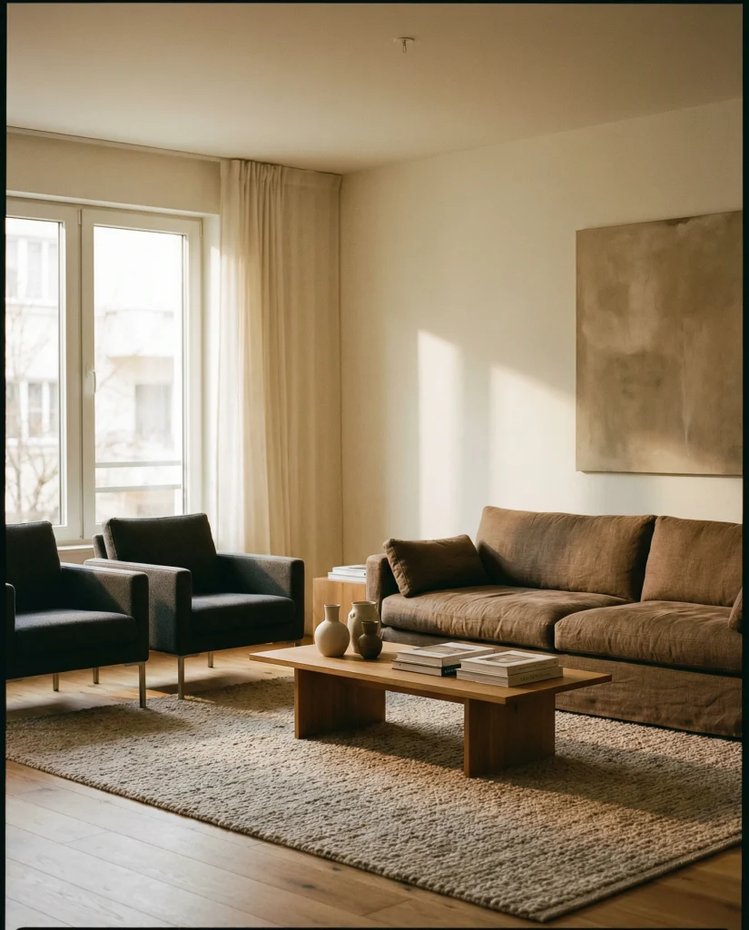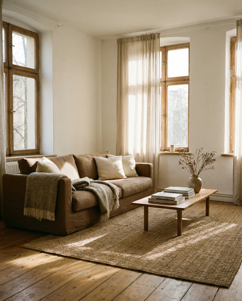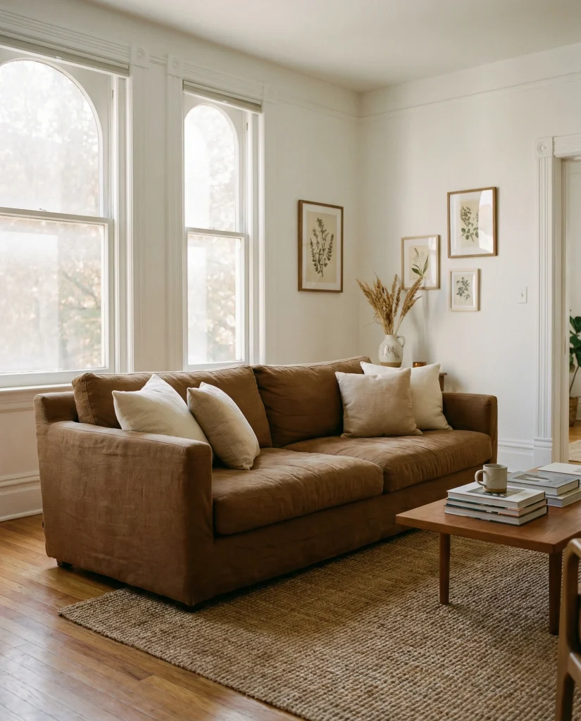 Brown seating can feel bright and modern when surrounded by light whites and airy neutrals. This approach is common in smaller homes where people want both warmth and openness. The brown couch becomes a focal point that adds structure without overwhelming the space, making the room feel fresh and calm.