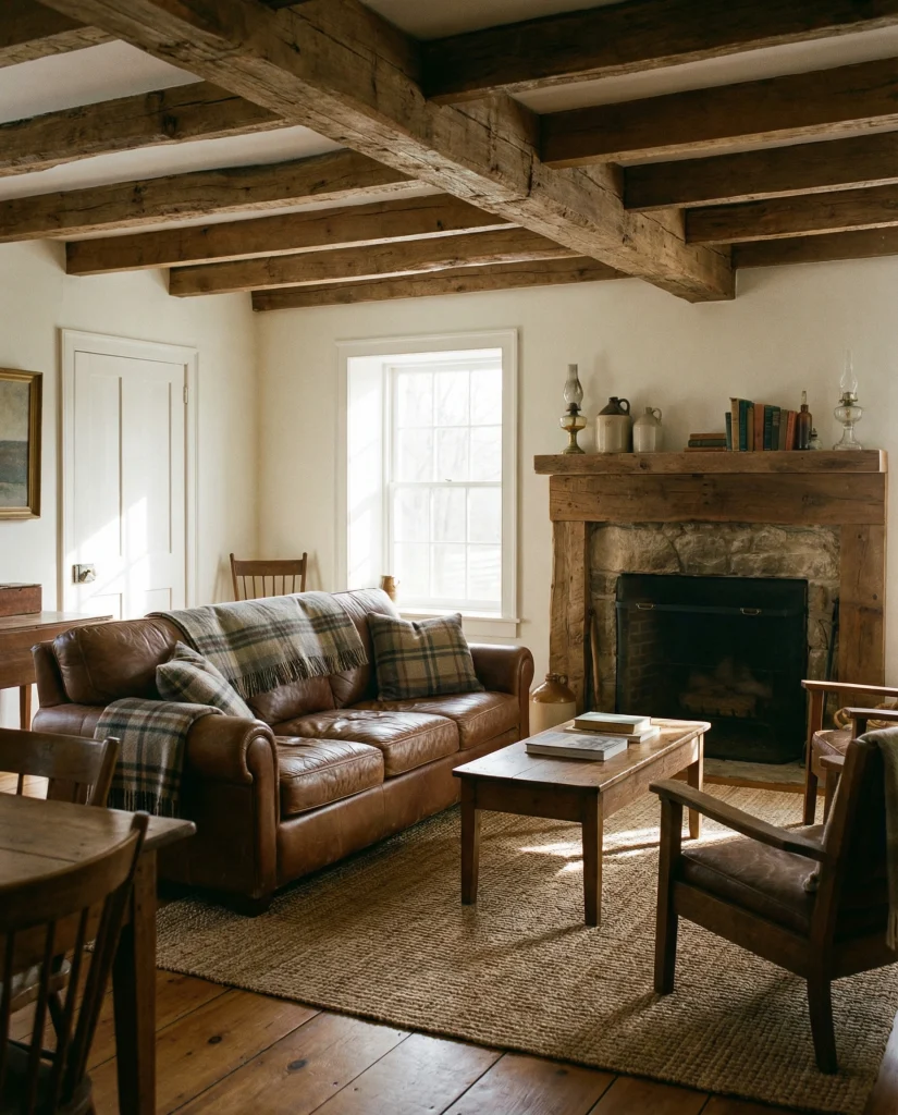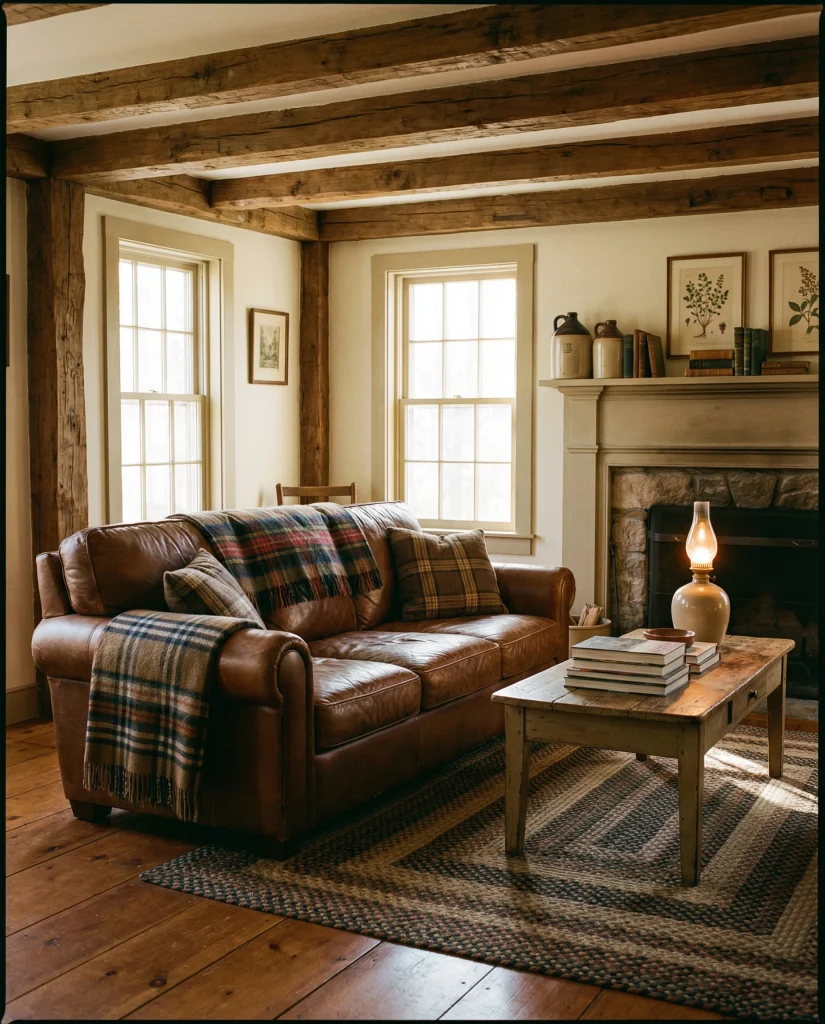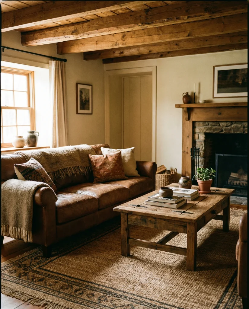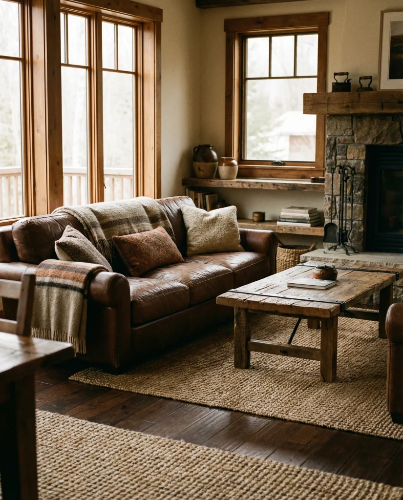A coffee- or rustic-brown couch pairs naturally with reclaimed wood, iron details, and earthy textures. It’s a style familiar to anyone who has visited a cozy mountain cabin or traditional family home. The look emphasizes durability, authenticity, and a connection to natural materials, making the room feel grounded and dependable.