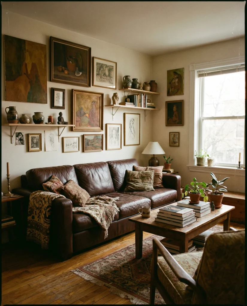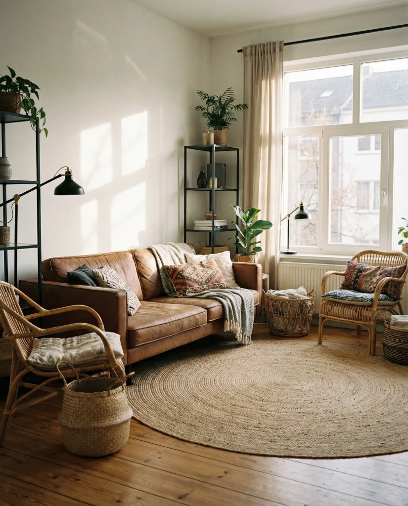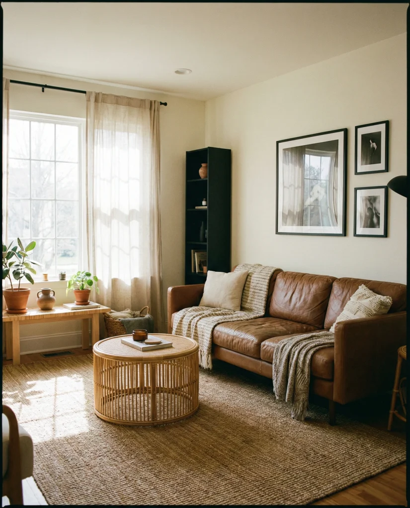 A modern interpretation of bohemian leather combines structured silhouettes with natural fibers like rattan, jute, and clay. The brown sofa ties these elements together, giving the space warmth without clutter. It works well in urban homes where people want creativity and order in equal measure.
