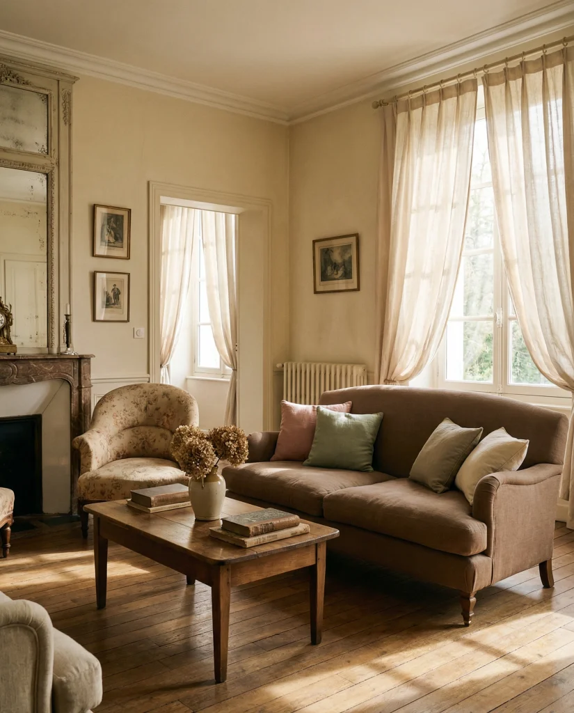 A medium brown sofa can easily slip into a French-inspired living room, especially with curved furniture, soft drapery, and muted pastels. This style brings a gentle romantic feel, giving the home a sense of refined comfort. It works well for people who appreciate beauty in subtle details rather than flashy décor.