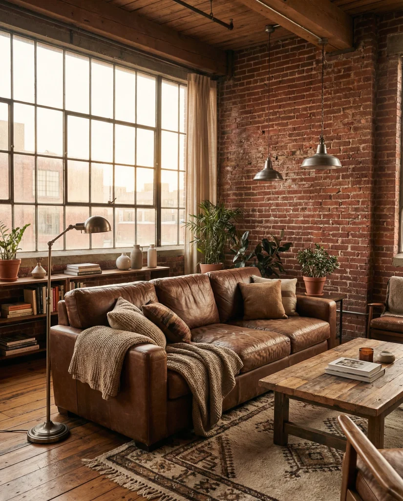 A coffee-brown couch looks striking against exposed brick walls, industrial lamps, and metal accents. This urban-loft style offers a blend of grit and warmth, creating a cozy environment in city apartments. It’s a great fit for those who love industrial aesthetics but still want an inviting, lived-in feel.