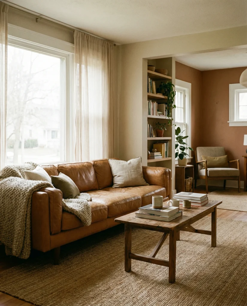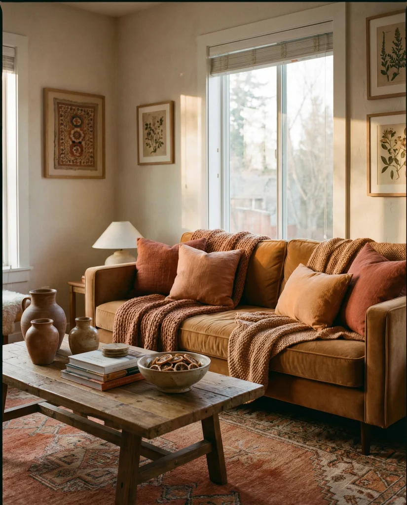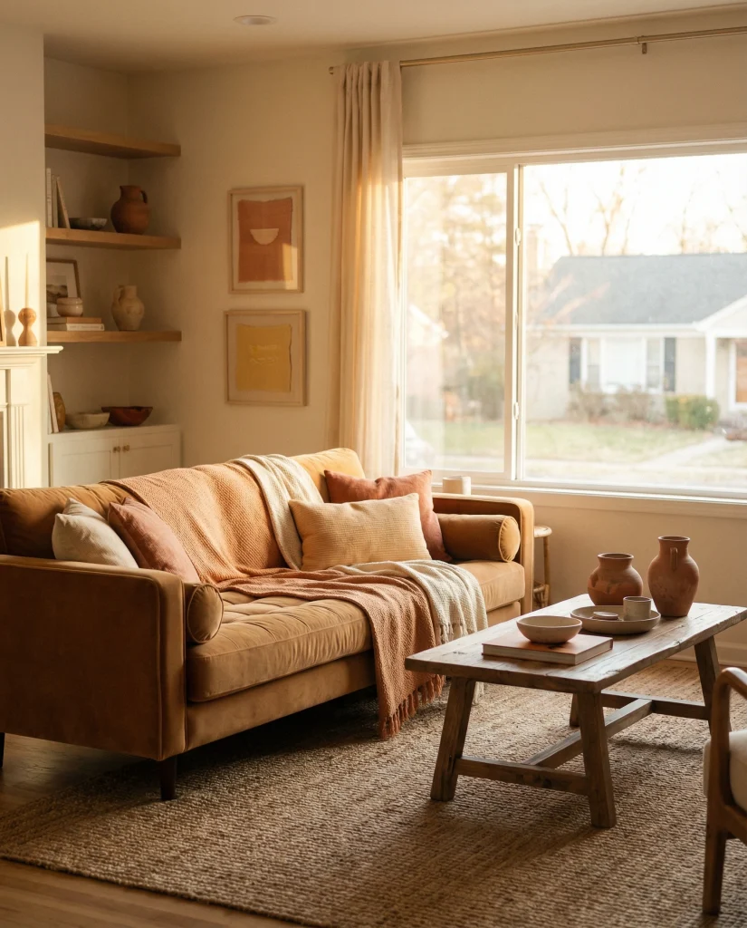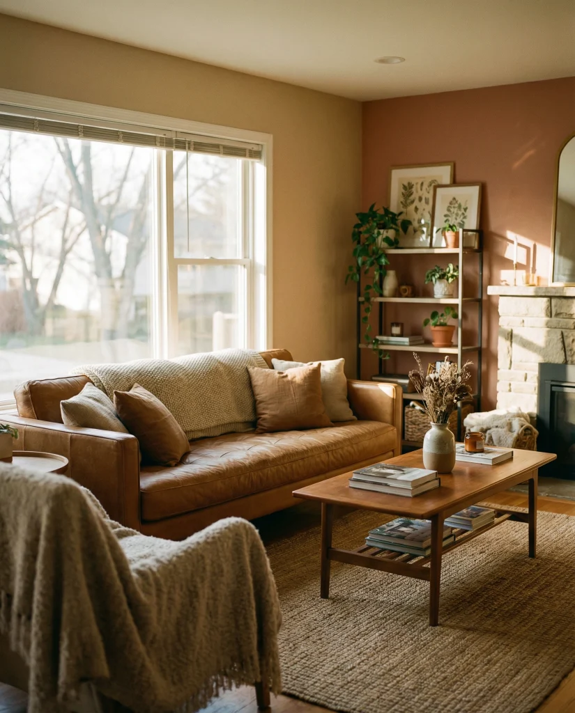 A caramel couch comes alive when paired with sunset-inspired hues like clay, apricot, and muted orange. These tones create a rich, golden warmth that feels uplifting and artistic. It suits homes where people enjoy experimenting with color while keeping an earthy foundation.