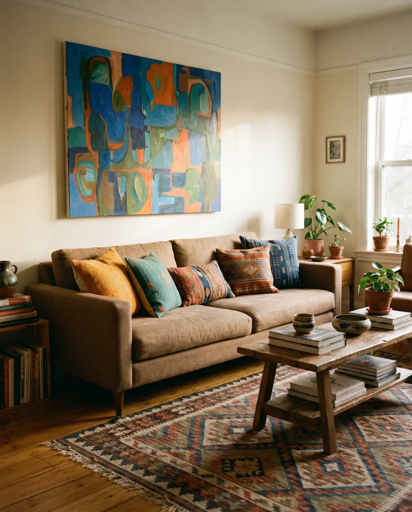 A medium brown couch creates a stable base for a colorful palette, giving freedom to mix bold patterns, vibrant pillows, and lively artwork. I’ve seen this approach in creative homes where people want personality without visual chaos. The brown shade keeps everything balanced, allowing bright and muted tones to blend effortlessly.