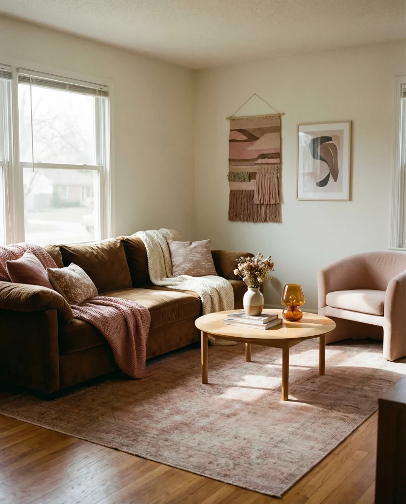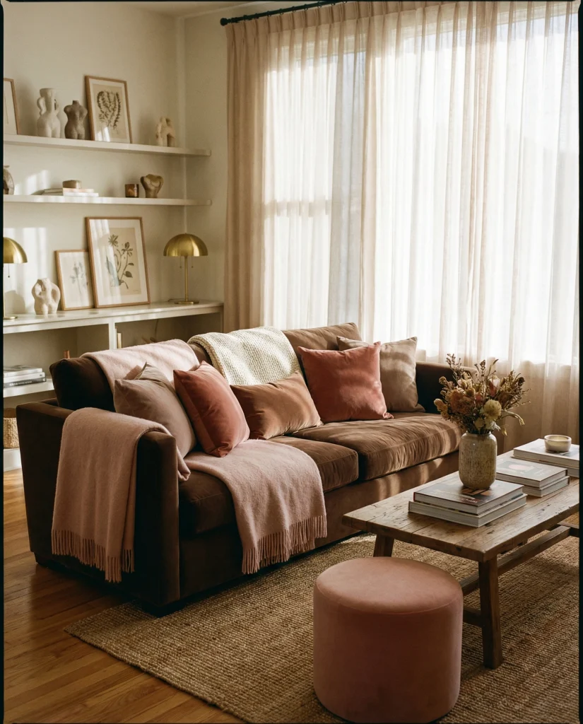 A girly atmosphere doesn’t need to be overly sweet; pairing brown with blush or muted pink adds softness while staying grounded. Many young professionals use this mix to create a feminine yet grown-up living room. The brown couch balances the airy tones, making the space elegant and warm.