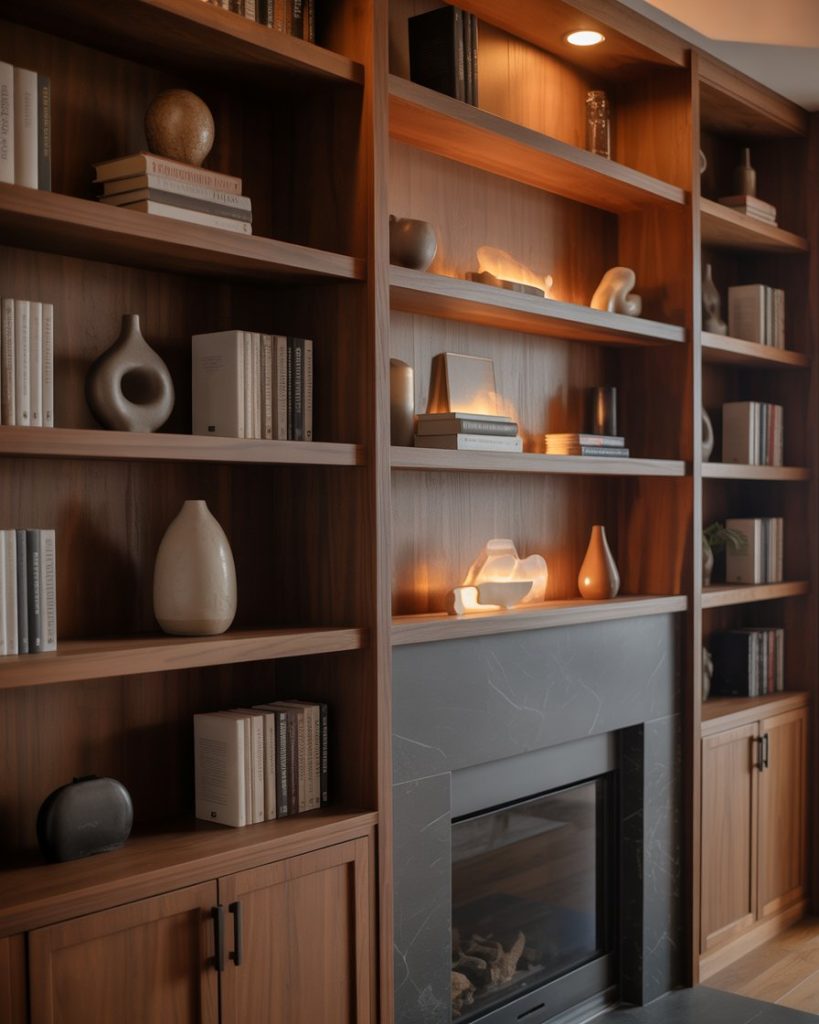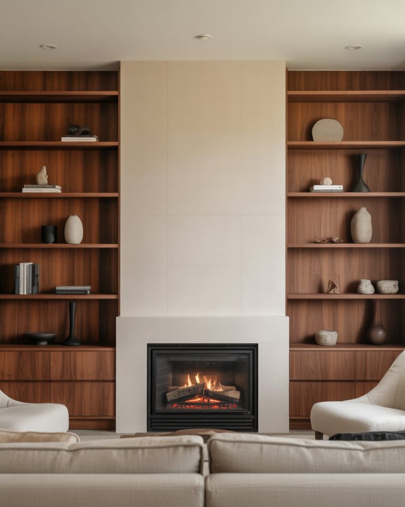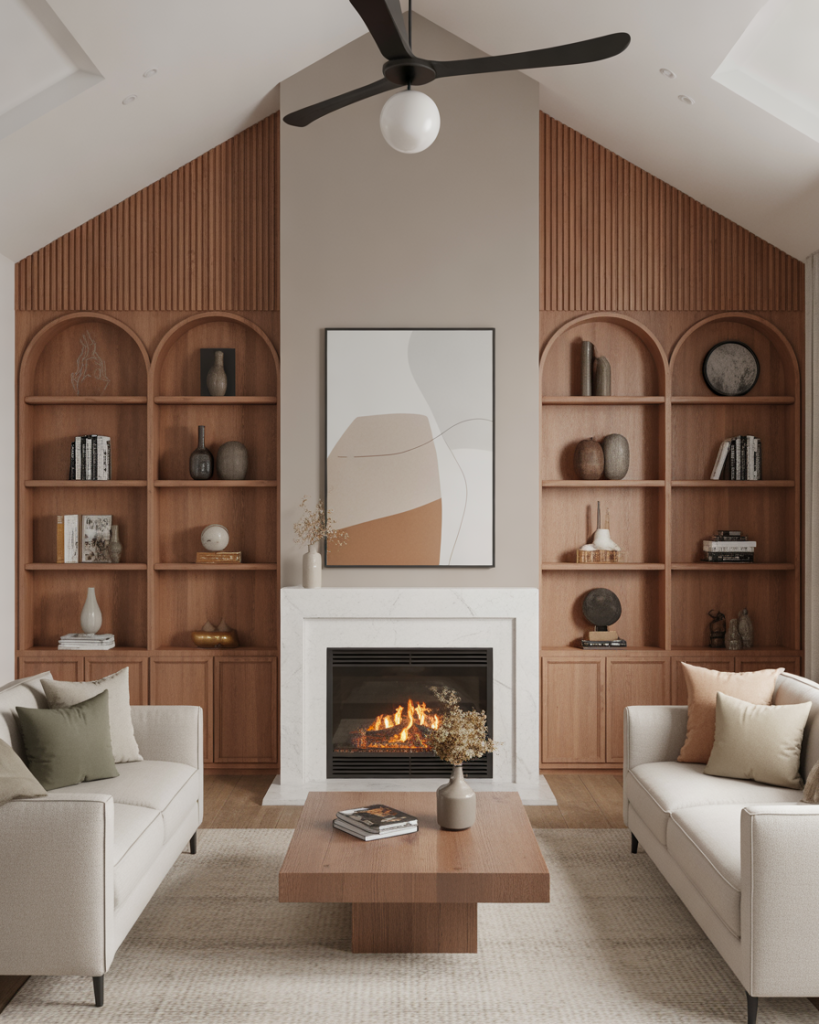 Tall architectural structures like a fireplace or tall ceiling design can feel overwhelming without balance. Adding built-ins on the side of the fireplace helps anchor the height, creating symmetry and styling opportunities. Many Americans use Ikea bases upgraded with custom doors for an affordable semi-custom look. Wood magazine often features these hybrid setups as budget-friendly alternatives to full cabinetry.