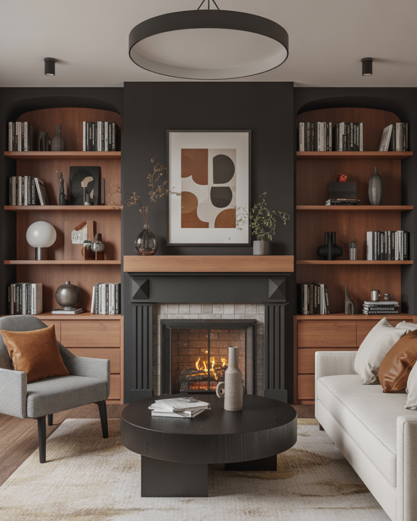 Black-accented built-ins use black, brown, and white contrasts to create a modern, moody aesthetic. This style feels fresh in 2026, especially paired with metal sconces or minimalist painting details. Homeowners often place built-ins along a long wall or frame a TV for drama. Designers at Architectural Digest highlight this as a high-impact look that still feels livable for the average American household.
