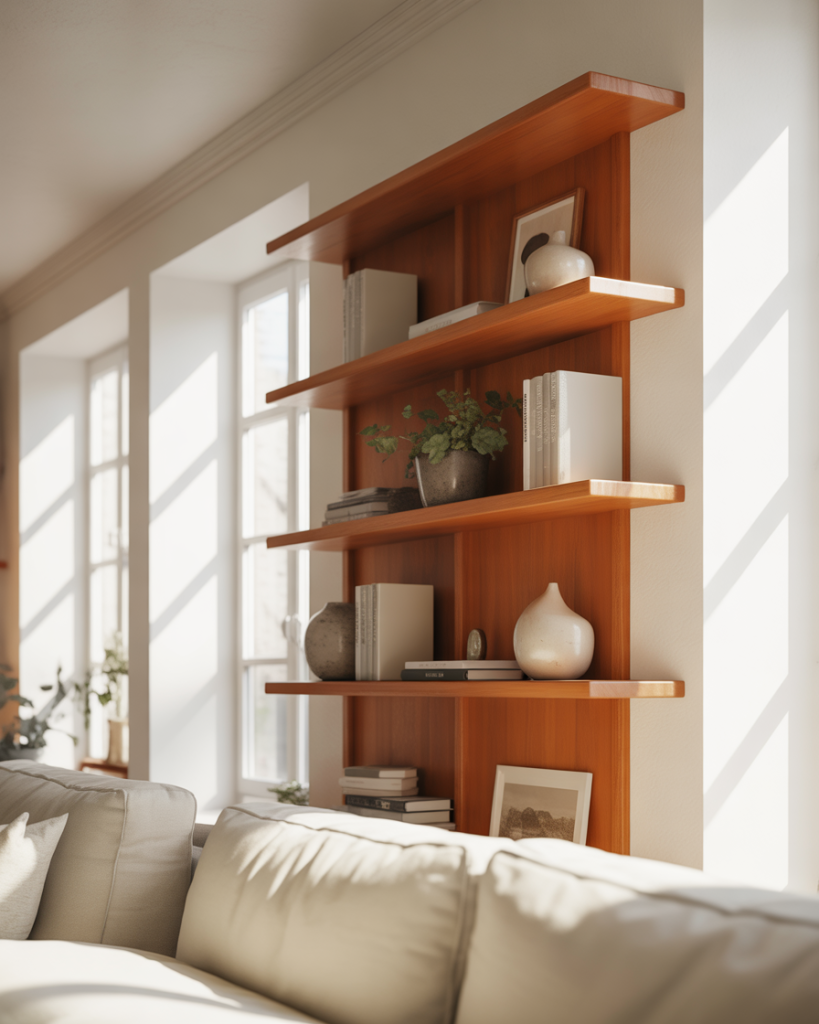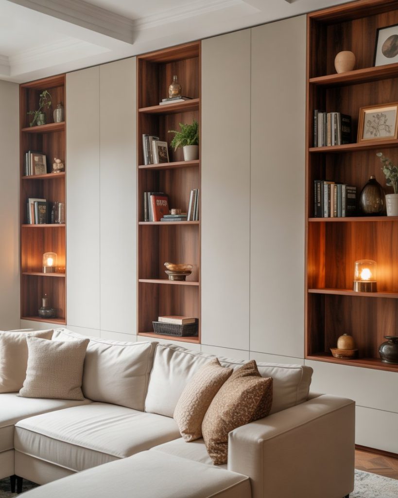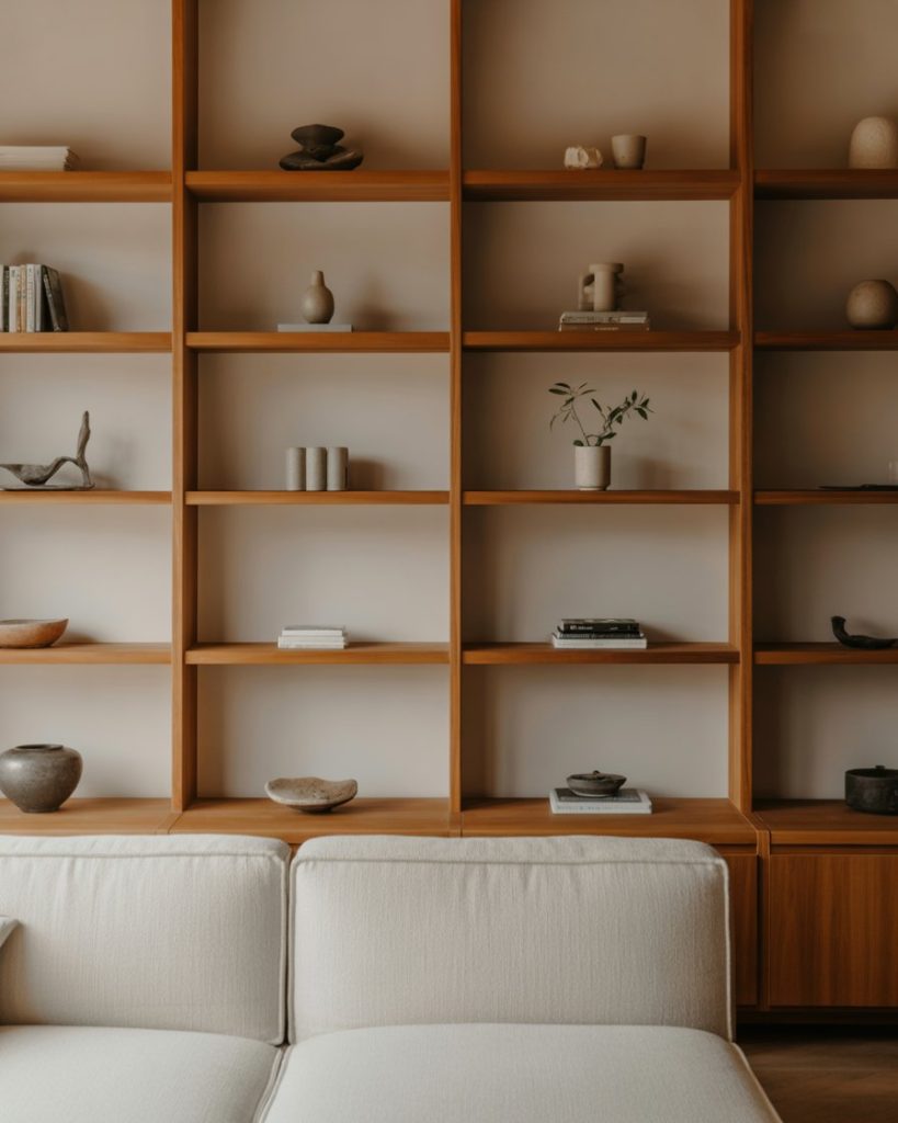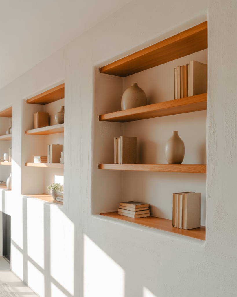 Scandi-inspired built-ins emphasize wooden shelves, soft neutrals, and calm decorating choices. These shelves work especially well near a window or corner, where natural light enhances the material. Many Americans choose this look for its simplicity and function, drawing inspiration from IKEA-based makeovers featured on Remodelista. Light brown, white, and soft gray tones keep the room soothing year-round.