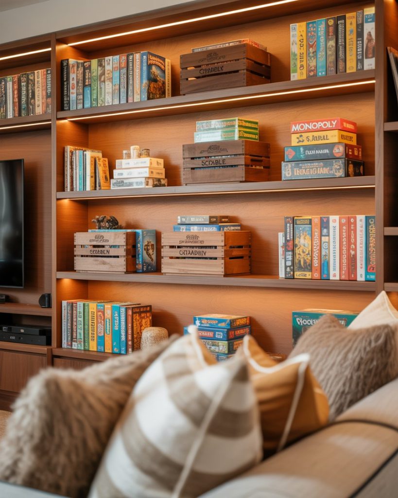 Built-ins dedicated to a family game zone create a fun and functional display that blends shelves with closed storage. Adding decor ideas, board games, and soft lighting around a wall or corner keeps the space family-friendly. Many Americans use DIY baskets, wooden crates, and decorating tricks from designers like Chris Loves Julia to keep the area tidy and inviting. This design works well for open-concept homes needing structure.