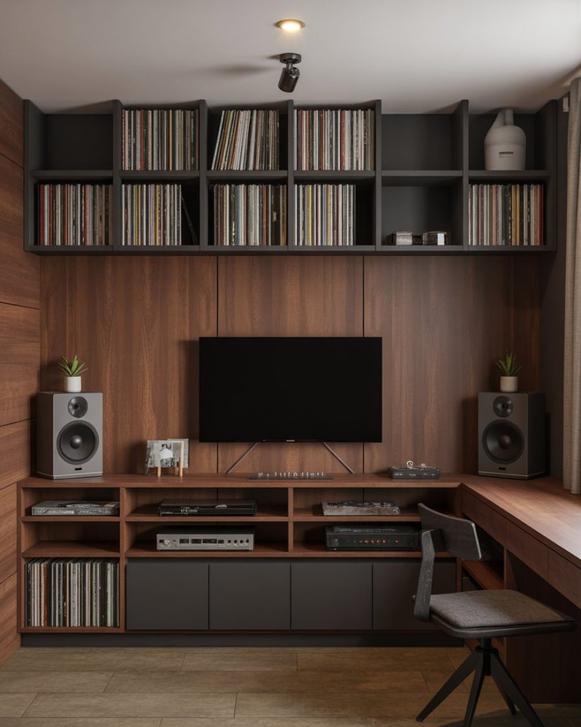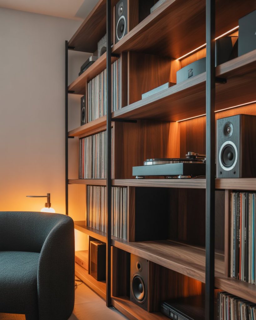 Music lovers enjoy built-ins that showcase vinyl collections and speakers. A brown or black base cabinet hides cords, while shelves above hold albums and decor. Placing this setup near a window or a free corner adds warmth. Inspired by Apartment Therapy music-room tours, Americans lean into wooden shelving and simple decorating to elevate their listening space in 2026.