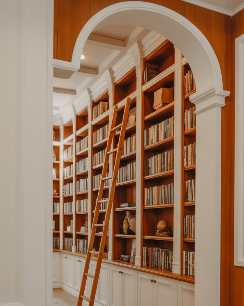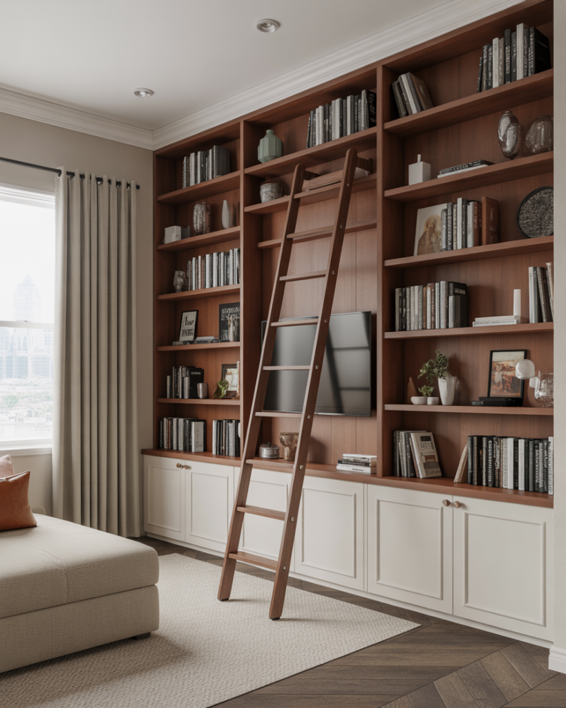 Library built-ins with a rolling ladder feel dramatic yet practical. Homeowners often pair white or brown shelving with a tall fireplace or a vaulted ceiling for a grand impression. Designers like Shea McGee note that this look increases vertical storage while enhancing styling possibilities. Ladder systems can be DIY or custom, making the setup accessible for many budgets.