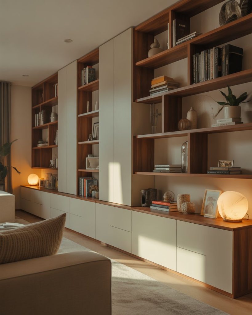 Some built-ins include lower cabinets to hide toys, electronics, or seasonal décor. These bases often use Ikea frames paired with paintings or custom doors. They sit beside a fireplace or under a TV, creating a polished, family-friendly solution. Influencers like House of Valentina praise this combo for blending beauty and practicality. Decorating the upper shelves keeps the look curated.