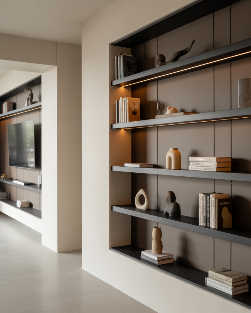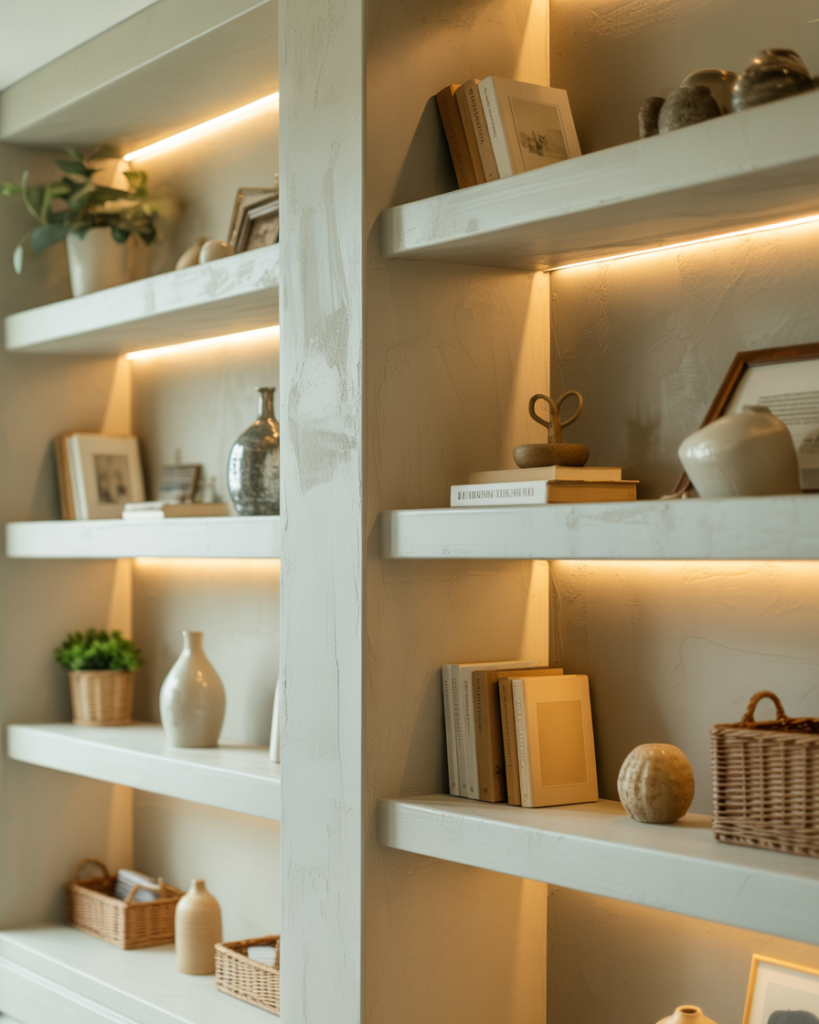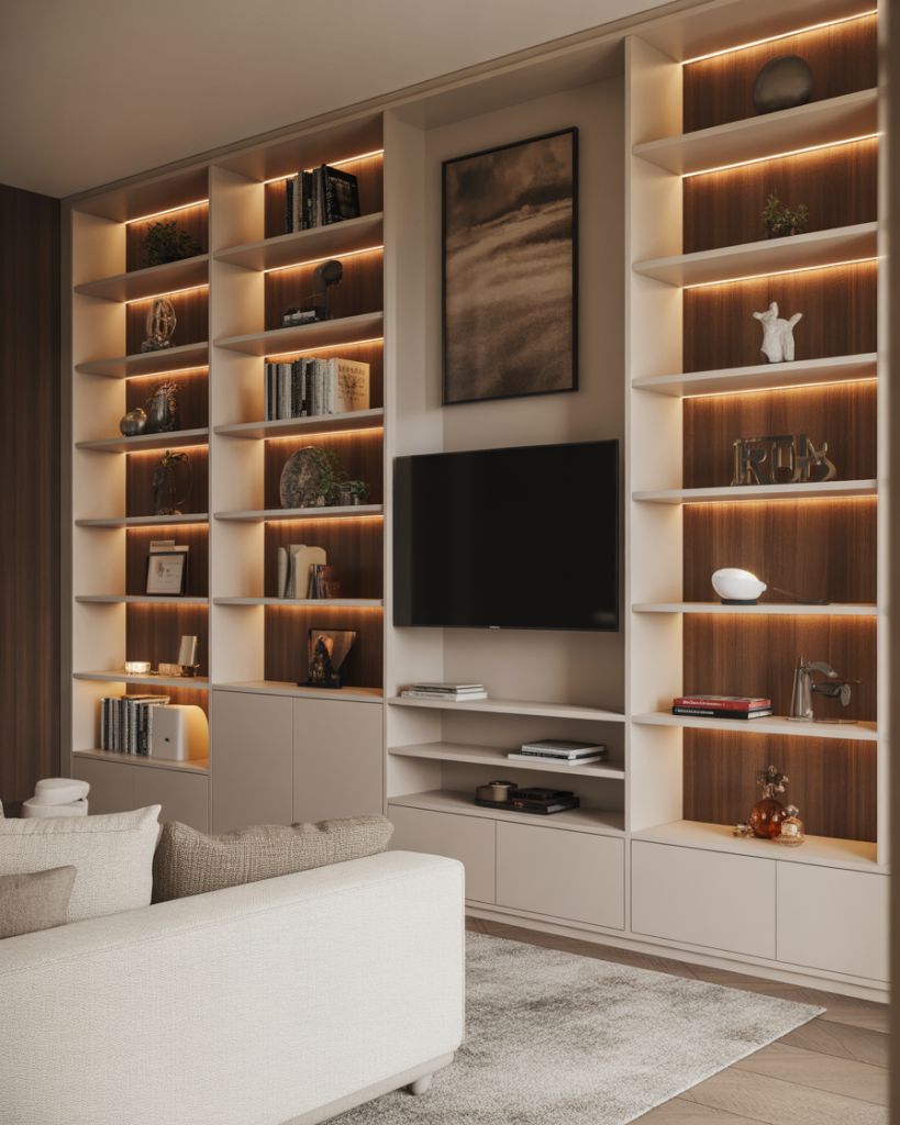 Lighting plays a major role in the 2026 built-in design. LED strips and sconces highlight decorating choices and make white or brown shelving glow softly. Many Americans use this technique around a TV, a window, or a fireplace to create ambiance. Inspired by designers at Havenly, integrated lighting elevates even simple DIY shelving to a custom level.