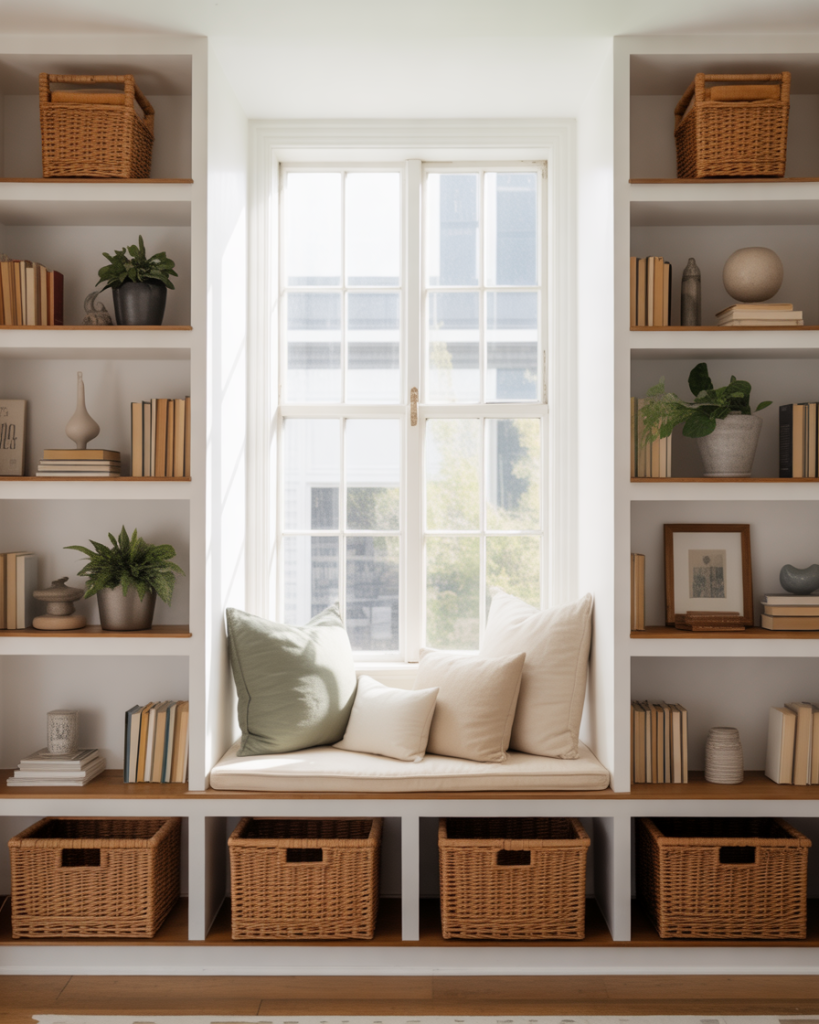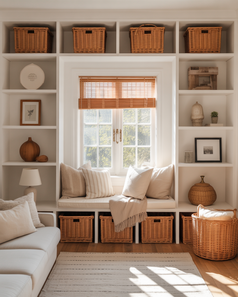 Built-ins designed around a window create a bright reading nook that feels airy yet grounded. Many homeowners incorporate DIY bench seating or decorate the shelves with large woven baskets for texture. This approach works beautifully in smaller living rooms, giving the space functional storage without feeling heavy. Influencers like Studio McGee highlight how this layout maximizes natural light and creates a welcoming lifestyle moment.