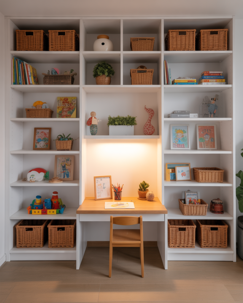 Families often install built-ins to contain art supplies, books, and toys. Using white shelving with brown baskets keeps the room tidy yet cheerful. A small desk below the shelves turns the setup into an all-in-one creativity station. Designers on The Spruce emphasize decorating with labeled bins to help kids stay organized and independent.