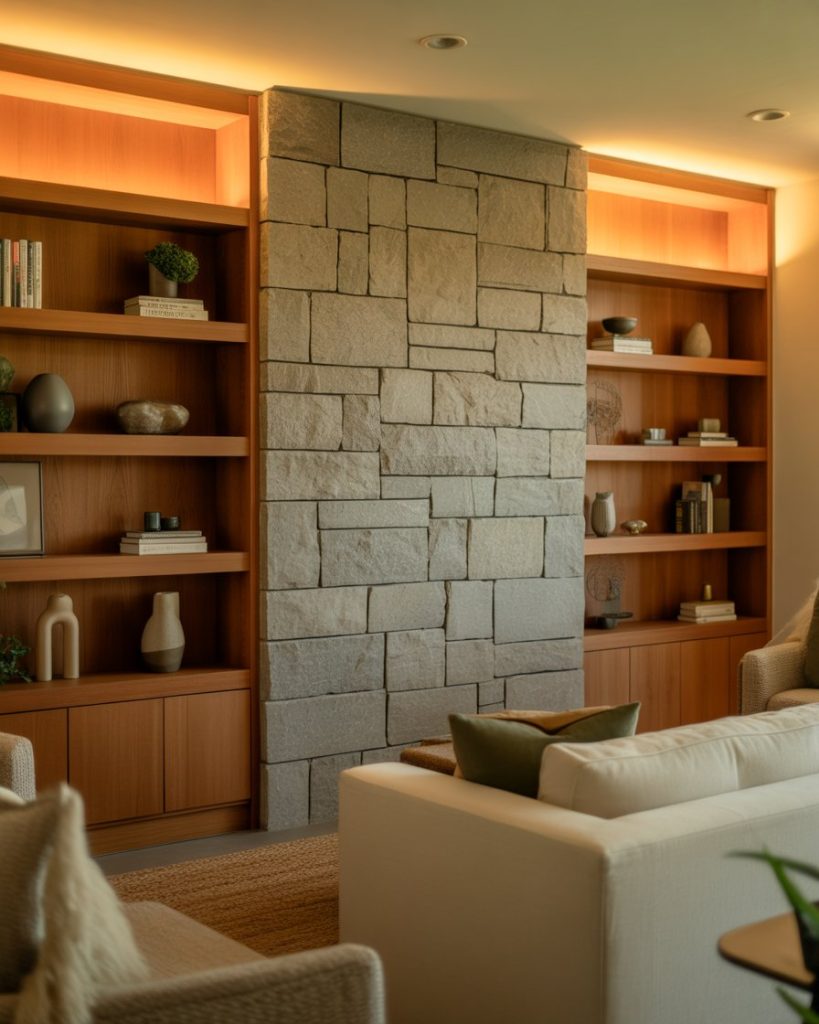 Built-ins surrounding a stone or stone-look feature wall add texture and depth to a living room. When placed by a fireplace or electric fireplace, they create a cohesive, natural look. Many Americans choose wooden accents and minimal decor ideas to keep the materials balanced. This trend, often featured by designers on HGTV, brings earthy elegance into 2026 homes.