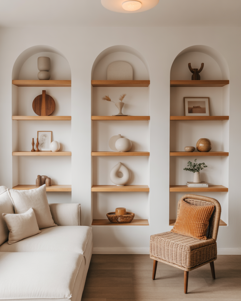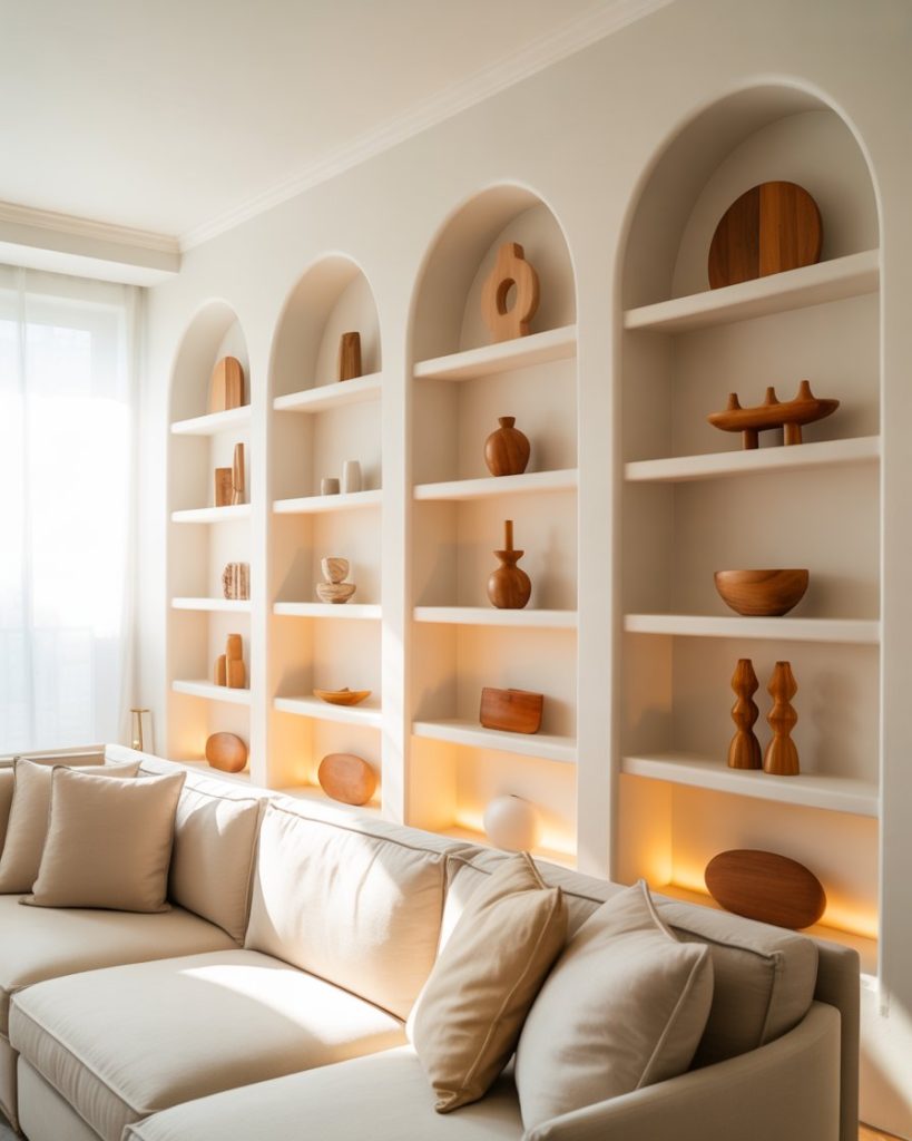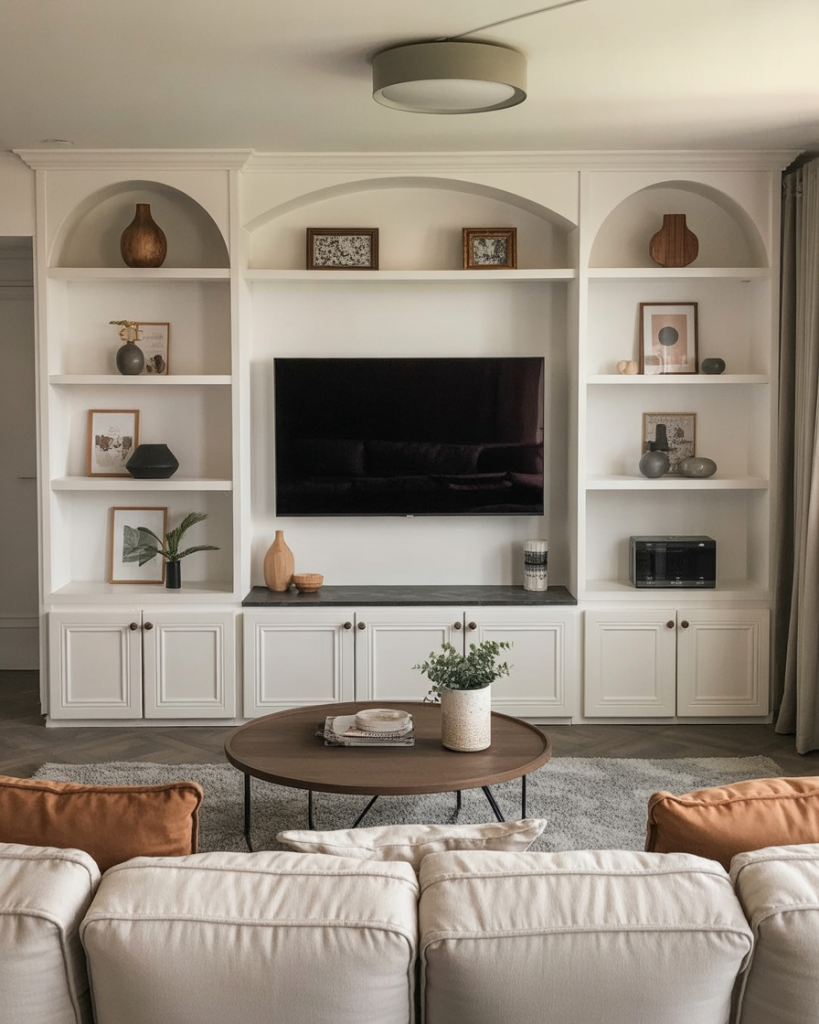 Adding an arch around built-in shelving creates a softer, architectural look that feels fresh for 2026. This shape pairs beautifully with white paint, wooden accessories, or subtle painting finishes that elevate the living room. Many young homeowners lean into this aesthetic for its blend of vintage and modern influences. Designers like Sarah Sherman Samuel often use arches to add personality without overwhelming the space.