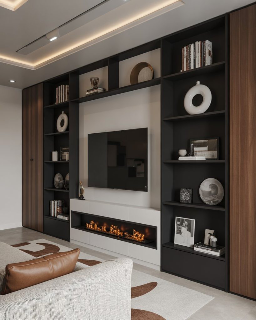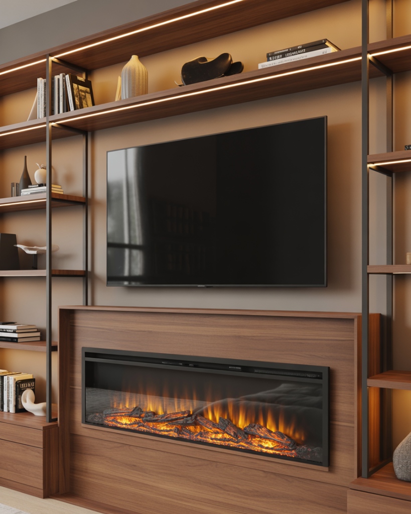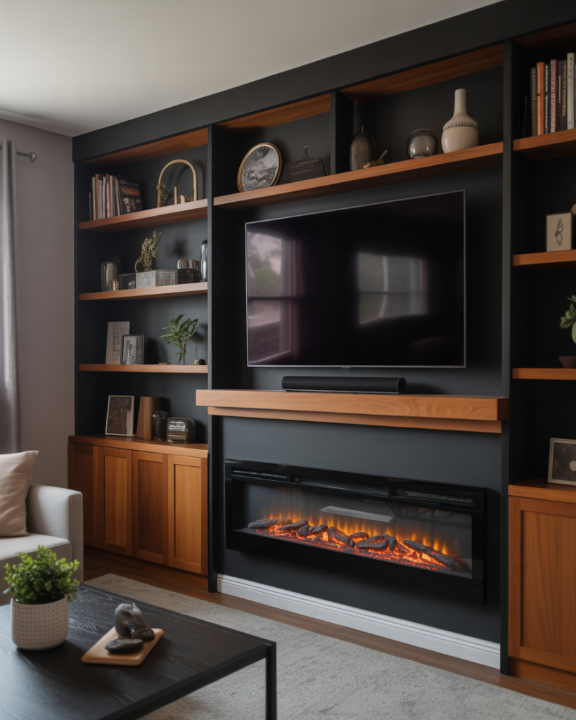 Built-ins that combine a TV and electric fireplace offer both ambiance and efficiency. The electric fireplace provides warmth without heavy installation, while shelves frame the structure for seamless decorating opportunities. Many Americans prefer this setup for condos or newer builds where venting isn’t possible. Designers at Houzz often recommend integrating black metal details or brown wooden mantels to enhance coziness.