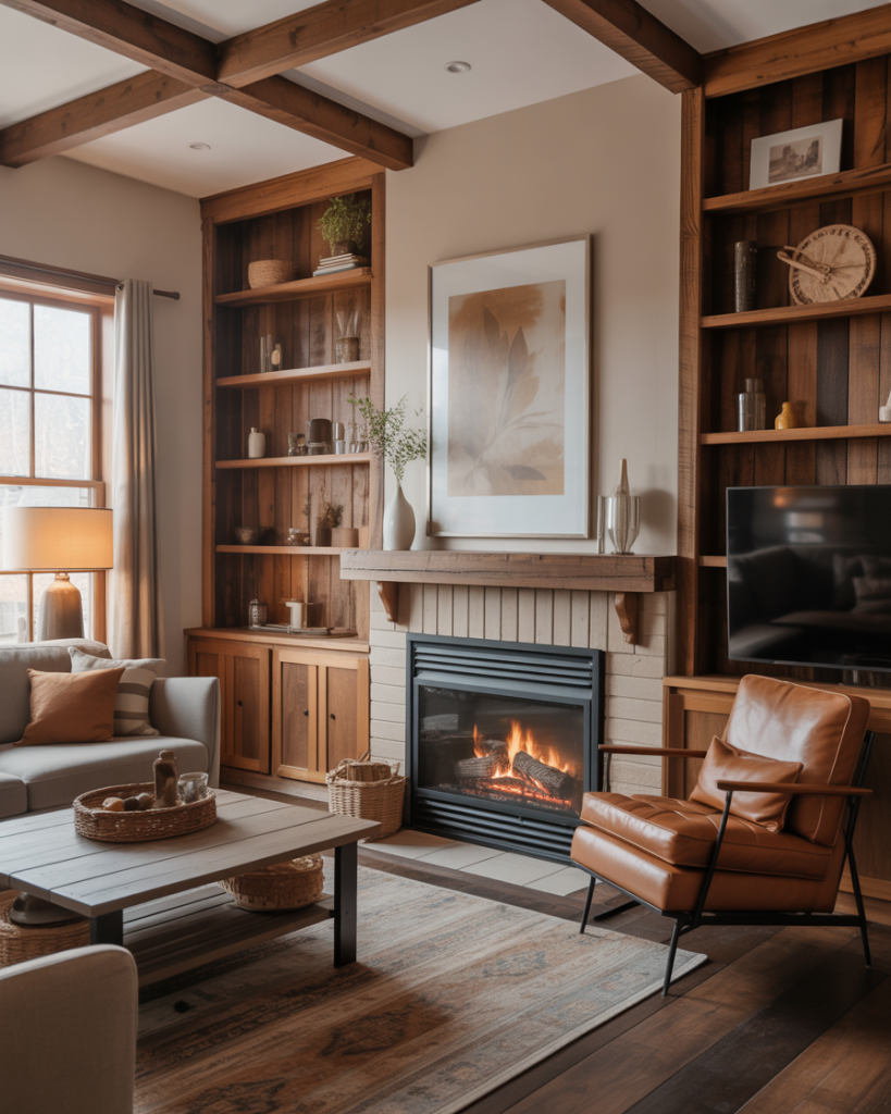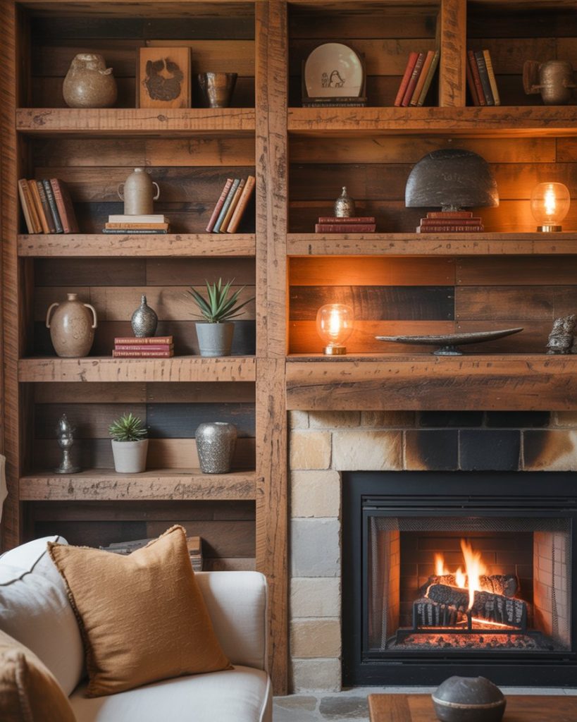 Rustic-inspired built-ins bring organic warmth with rustic wood tones, textured finishes, and earthy decor ideas. When paired with a fireplace or corner nook, they instantly feel lived-in and welcoming. Many Americans choose reclaimed wood or DIY staining methods for authenticity. Homes & Gardens often highlights rustic built-ins as a way to add history and visual depth even in newer construction.