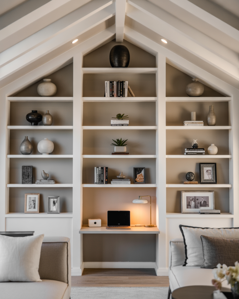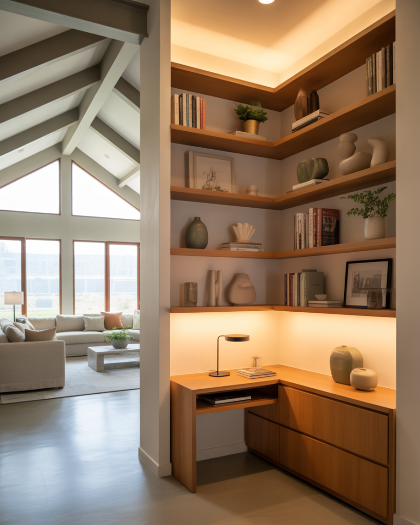 A built-in corner offers a smart solution for awkward spaces, especially in homes with vaulted ceiling layouts where walls feel expansive. Shelves used here provide display room for art, plants, and decor ideas, while keeping the main floor open. Many households use a desk at the base of the corner shelves for hybrid work, a trend rising across U.S. homes. This layout is practical and visually refreshing.