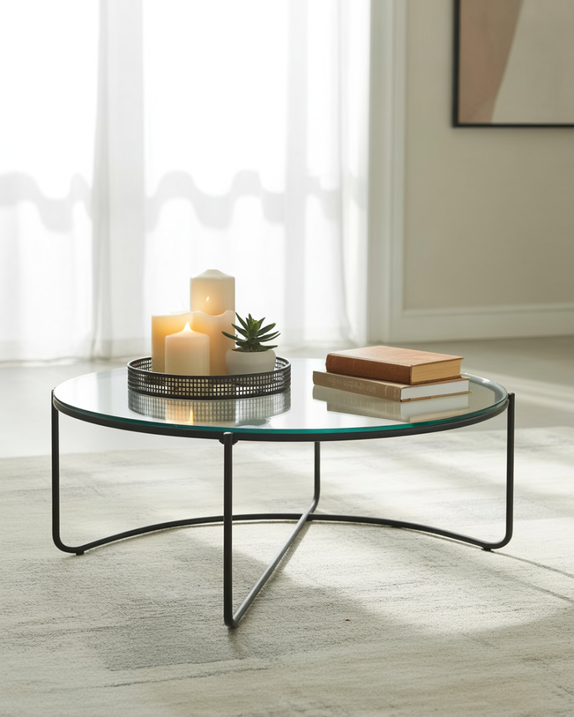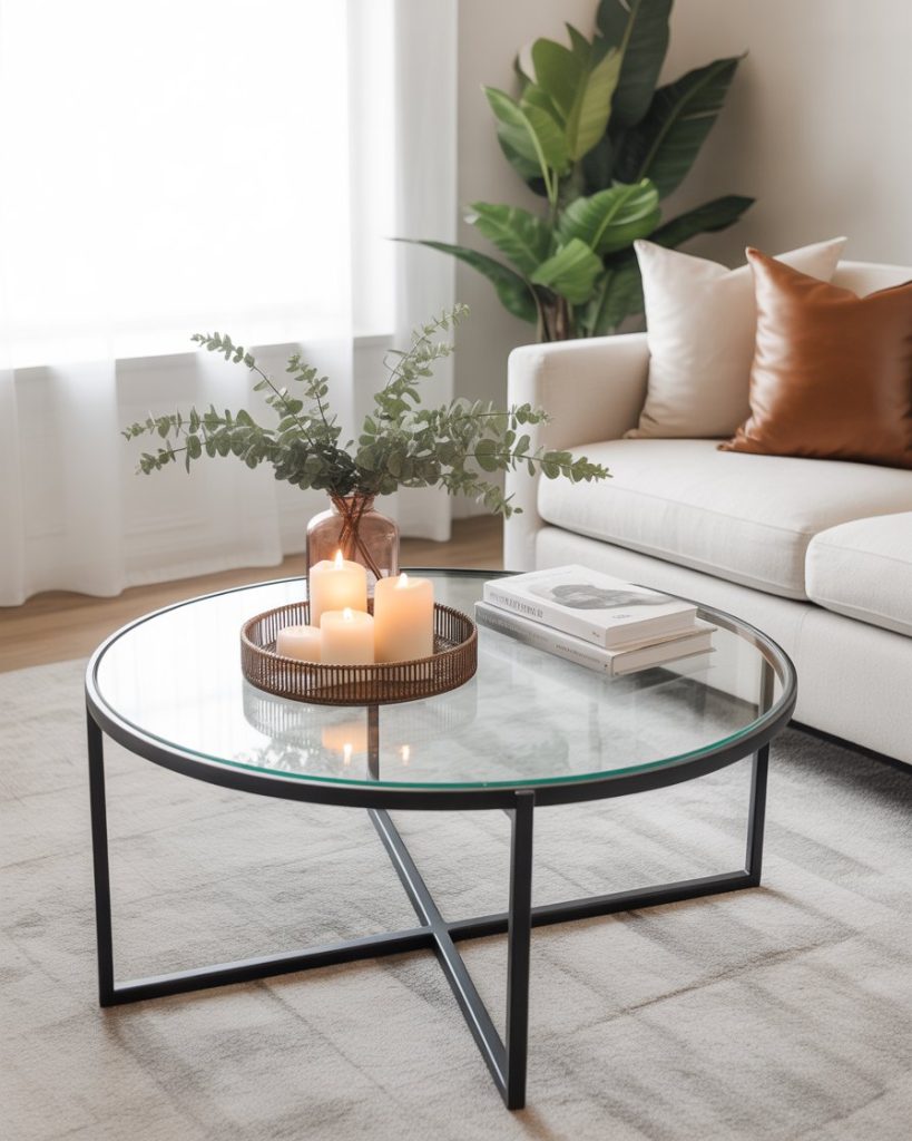 A round glass coffee table remains a timeless favorite, offering both lightness and sophistication. In smaller living room spaces, it prevents visual clutter and makes the area feel more open. Pair it with a tray of candles, books, and greenery for a modern yet warm touch. Frames in black or white allow for flexibility, complementing both urban lofts and coastal retreats. This design is about reflection, literally and figuratively—it reflects your style while giving the room an airy balance.