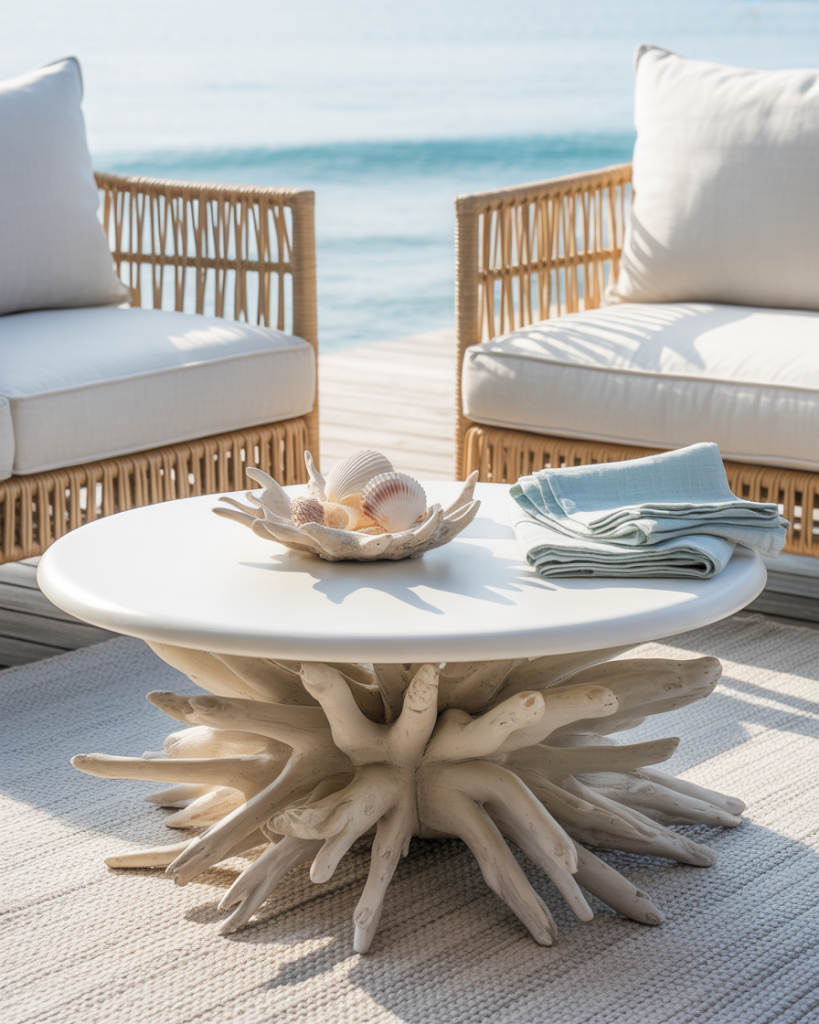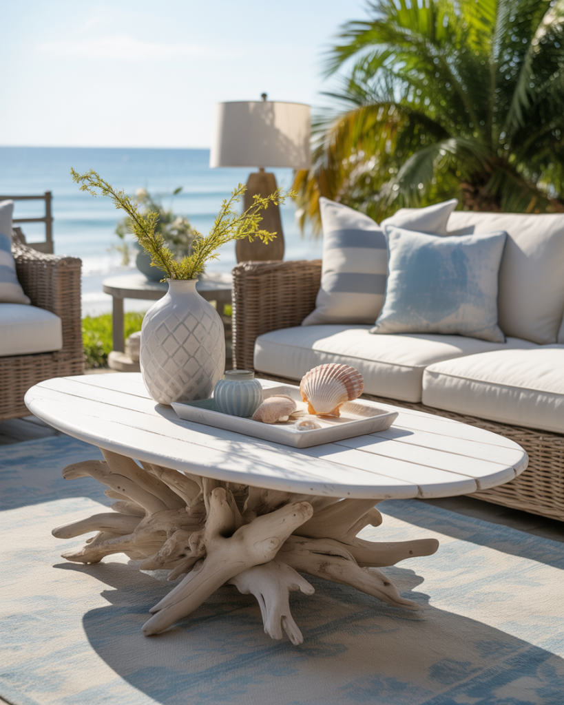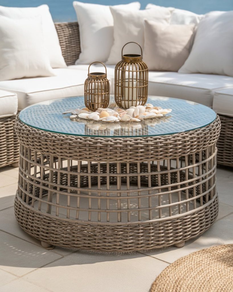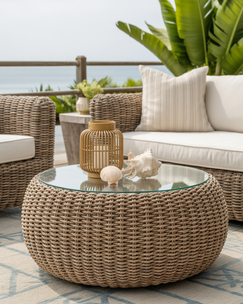 Outdoor coffee tables are no longer an afterthought. In 2026, outdoor rattan and wicker designs with glass tops dominate patios and sunrooms. A round or small round table works beautifully with coastal-inspired white cushions and natural fibers. Styling is easy: add a tray with lanterns or seashells for that breezy vacation vibe. This look captures the casual luxury of seaside living, perfect for anyone who dreams of coastal escapes.
