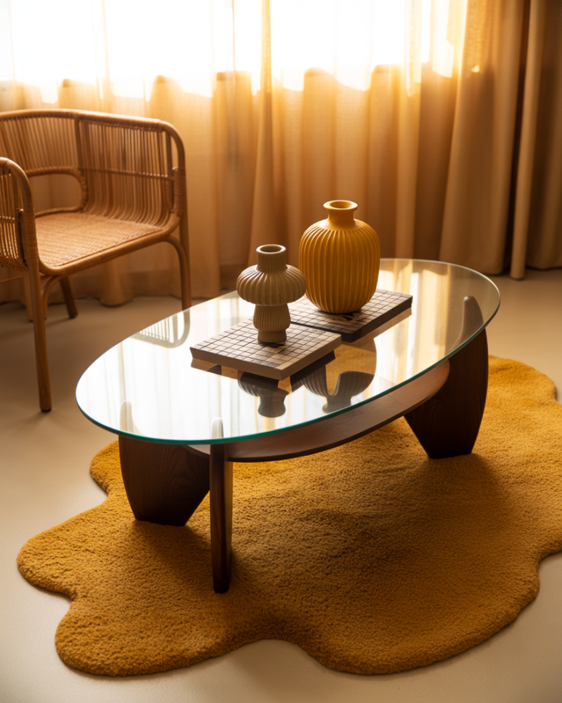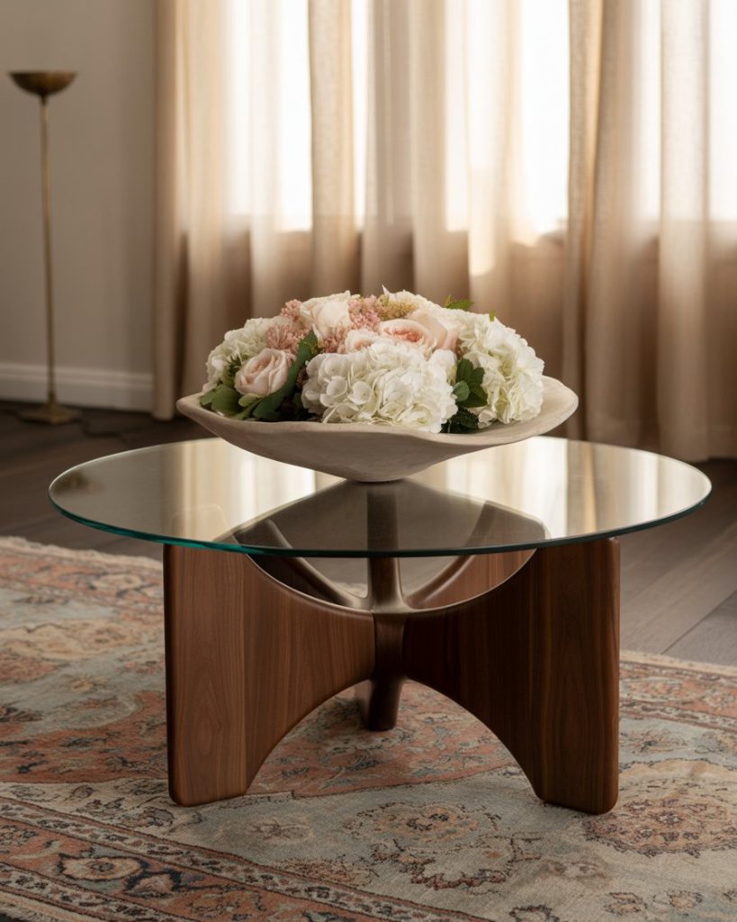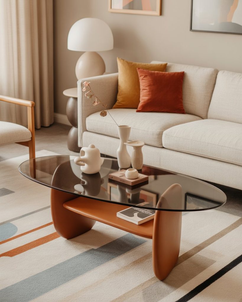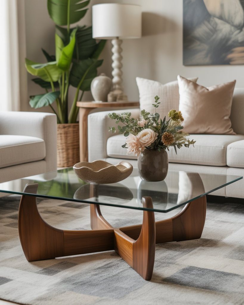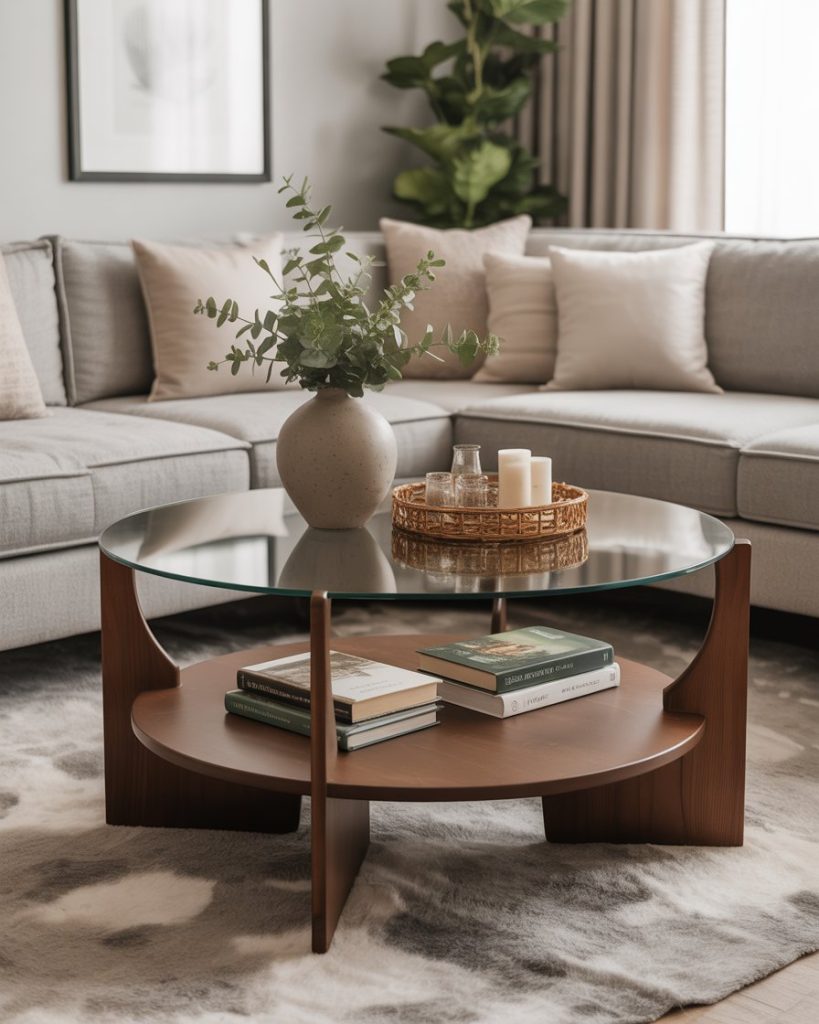 Combining glass with wooden bases creates a versatile design that bridges modern and vintage styles. The transparency of glass keeps the living room airy, while the solid base grounds the piece. This dual-material approach works beautifully in transitional homes, offering elegance without sacrificing warmth. A rectangle or round glass design can be styled with sculptural bowls or floral arrangements, giving you the best of both worlds in a single piece.