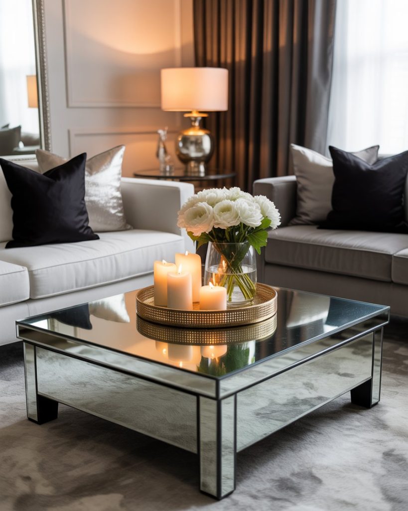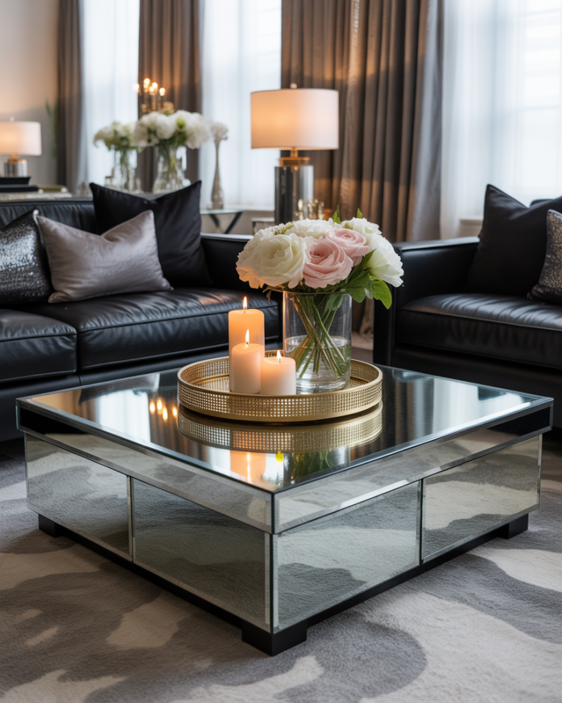 For those who love sparkle, mirrored coffee tables are set to shine in 2026. Often square or rectangle, their reflective surfaces amplify light in the living room, making them ideal for smaller or darker spaces. Pairing mirrored finishes with black or metallic accents creates a glamorous vibe reminiscent of vintage Hollywood. Keep décor restrained—a single tray of candles or flowers—to avoid overwhelming the eye. The look is chic, dazzling, and unforgettable.