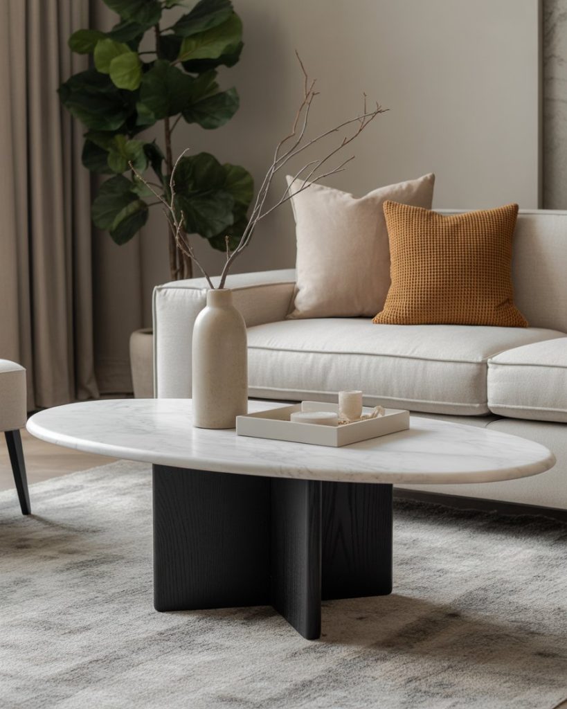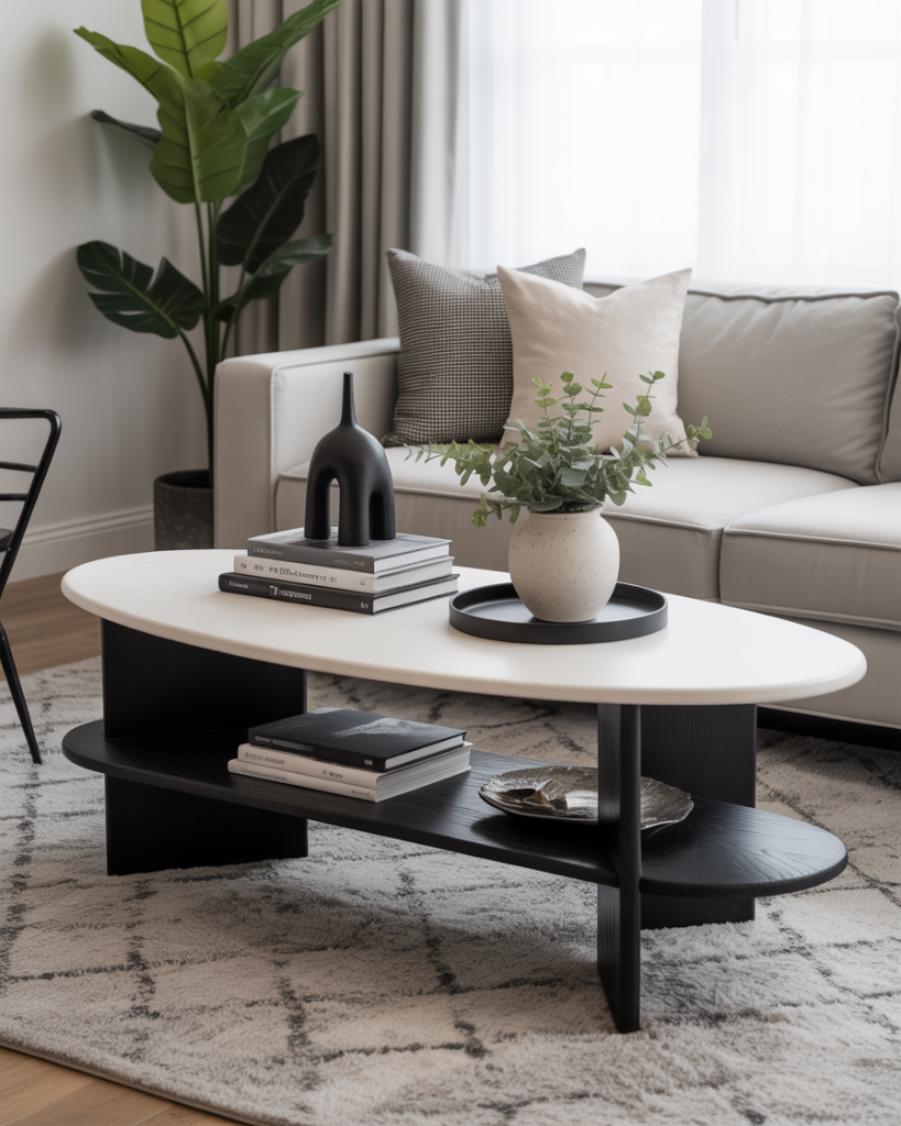 The power of black and white in design lies in its simplicity. A lacquered oval or rectangular coffee table in monochrome becomes a bold focal point in the living room. In 2026, styling these tables with geometric trays, monochrome books, or greenery enhances the crisp aesthetic. This look feels modern yet timeless, working equally well in sleek city lofts or more traditional homes. It’s proof that bold contrasts can be as elegant as they are striking.