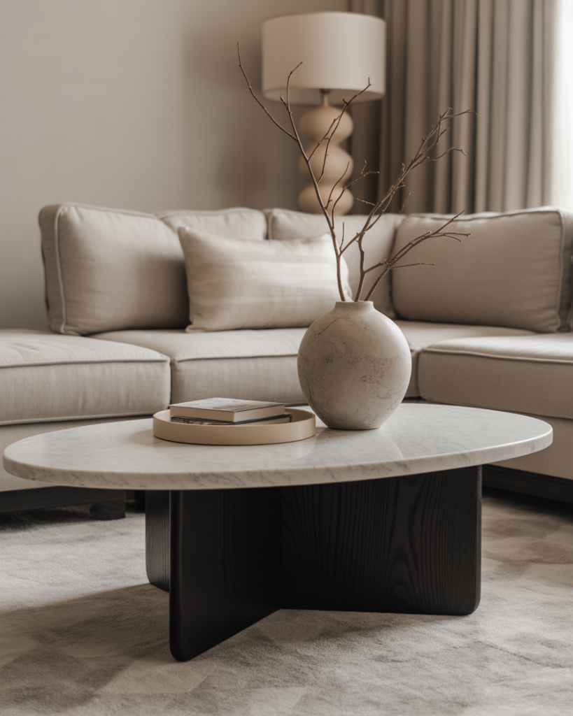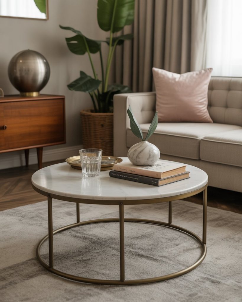 Stone coffee tables are a natural luxury that’s growing in popularity. Rectangle, oval, or round tops in marble, travertine, or terrazzo bring durability and elegance. Paired with black or brass bases, they become timeless centerpieces. The living room styling should stay simple, allowing the natural veins and textures of the stone to shine. A vase of branches or a neutral tray completes the organic look, grounding the space in earthy sophistication.