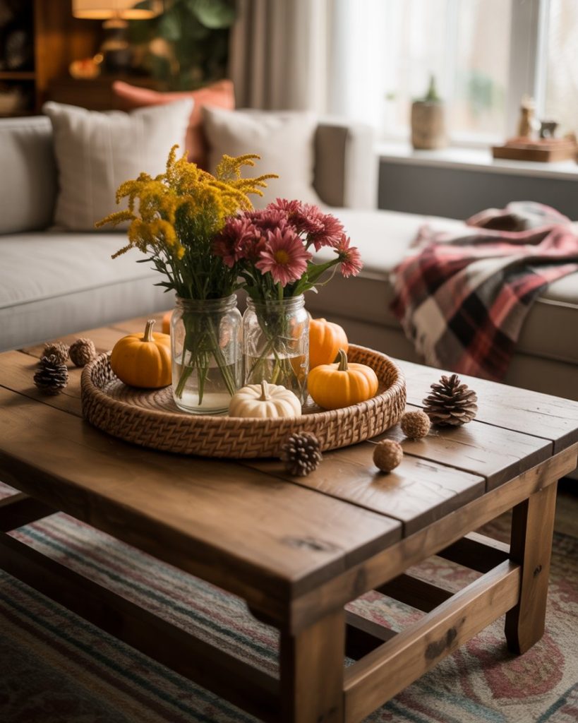 Few styles feel as comforting as a wooden table with farmhouse character. In 2026, reclaimed wood and distressed finishes lead the way, giving your table history and charm. A woven tray, mason jar florals, and seasonal accents like gourds or plaid fabrics bring warmth, especially in autumn. This design works beautifully for families who want their living room to feel inviting and unpretentious. It recalls weekends at grandparents’ houses—full of warmth, storytelling, and genuine comfort.