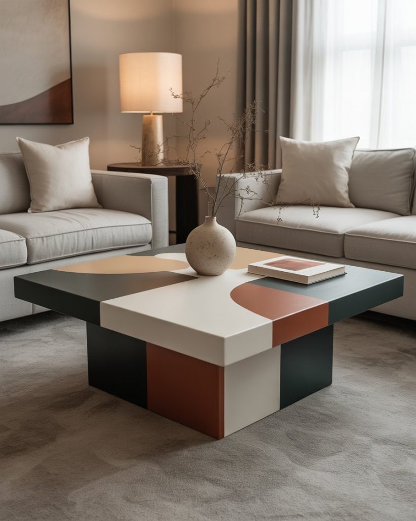 Painted coffee tables add personality to a small round, square, or rectangular base. In 2026, expect hand-painted floral, geometric, or abstract patterns that make the table a true work of art. Whether in modern bold colors or vintage faded tones, these tables express individuality. Styling should remain restrained—just a tray or single vase—so the design remains in focus. It’s an affordable, creative way to bring unique flair into the living room.