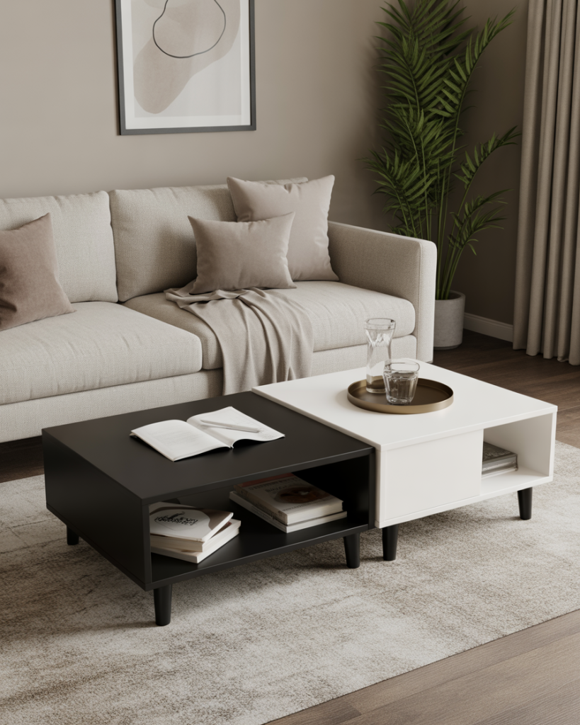 Functionality meets innovation in convertible coffee tables. In 2026, designs that lift, expand, or transform into desks or dining spaces are especially popular in urban apartments. A rectangular or square table in black or white finishes keeps the look modern, while hidden storage maximizes efficiency. Styling can stay minimal, with a tray for daily essentials. It’s perfect for small living rooms where every piece must work harder.