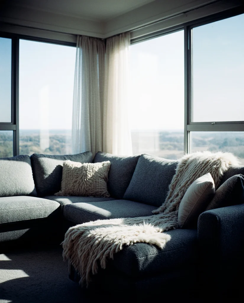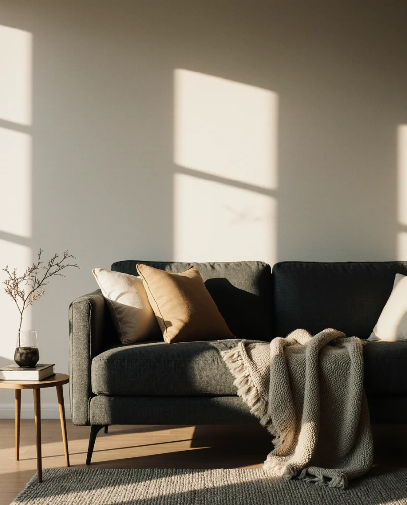 A dark grey couch creates depth within the room, acting as an anchor, while soft accessories lend warmth. Combined with warm neutral tones, soft lighting, and textured throws, the collection forms a modern, inviting feel to the room. This is especially functional for smaller spaces, as the couch adds visual weight to the room, and the overall collection doesn’t make the room feel heavy.