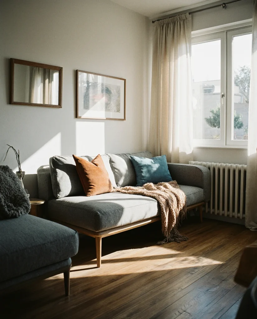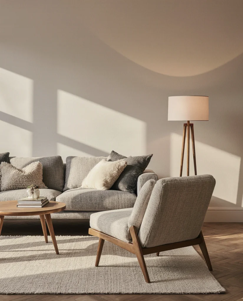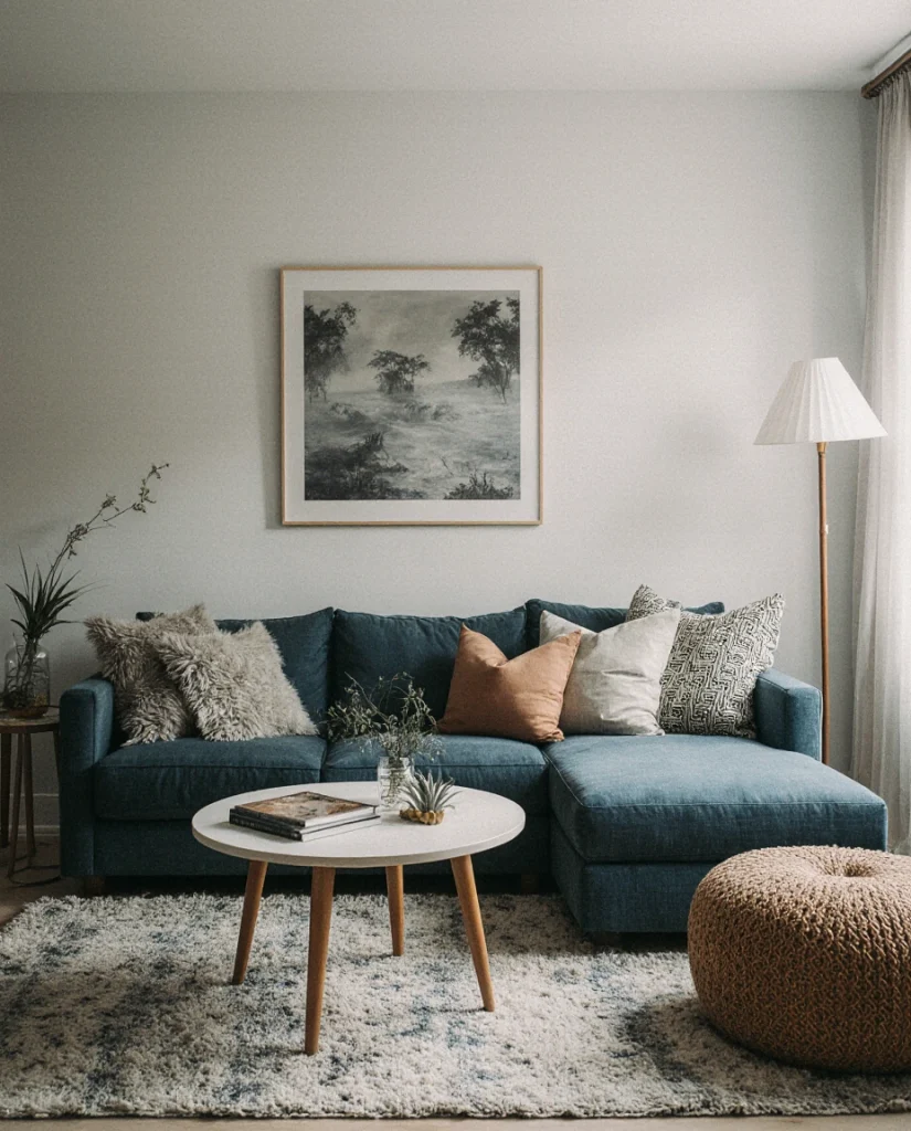 A midcentury modern living room becomes cozier by mixing classic silhouettes with warm textiles and soft accents. This style pairs well with grey couches, muted colors, or a subtle boho layer. Homeowners appreciate its balance of structure and comfort, making it a timeless choice for apartments and suburban homes alike.