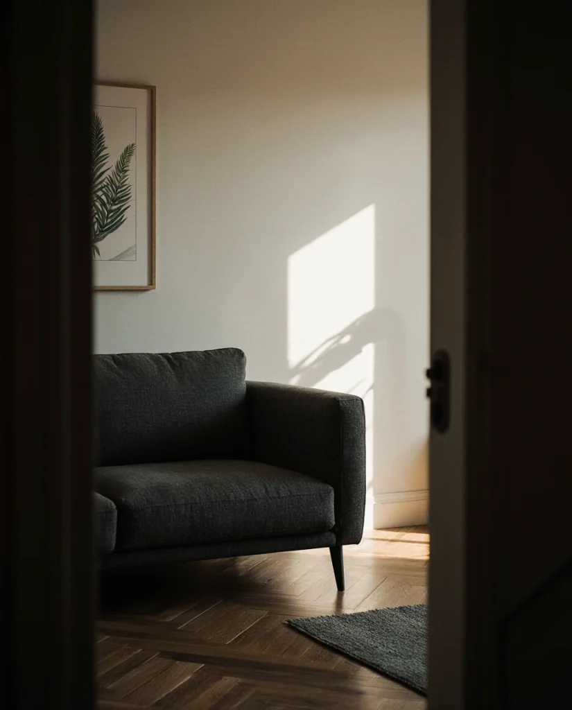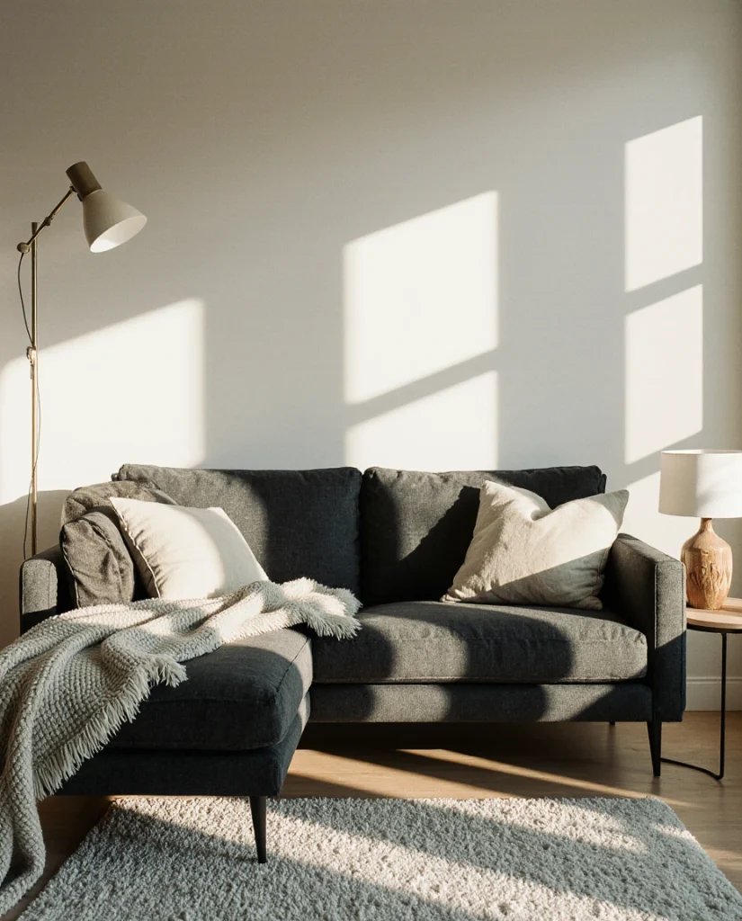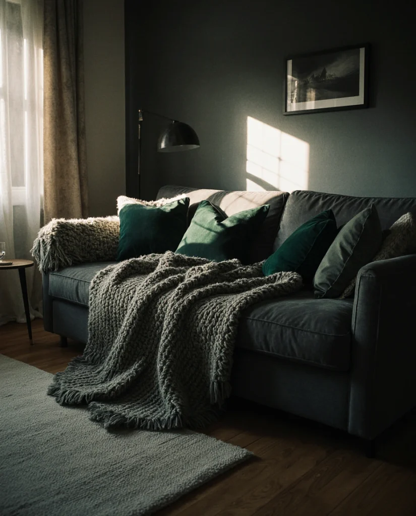 Using dark tones creates a cocoon-like comfort that feels intimate and warm. A dark grey couch becomes the anchor, especially when paired with soft lamps, textured throws, and muted accents. This moody style fits apartments and larger spaces, appealing to those who enjoy evening relaxation and richer palettes that feel comforting rather than heavy.