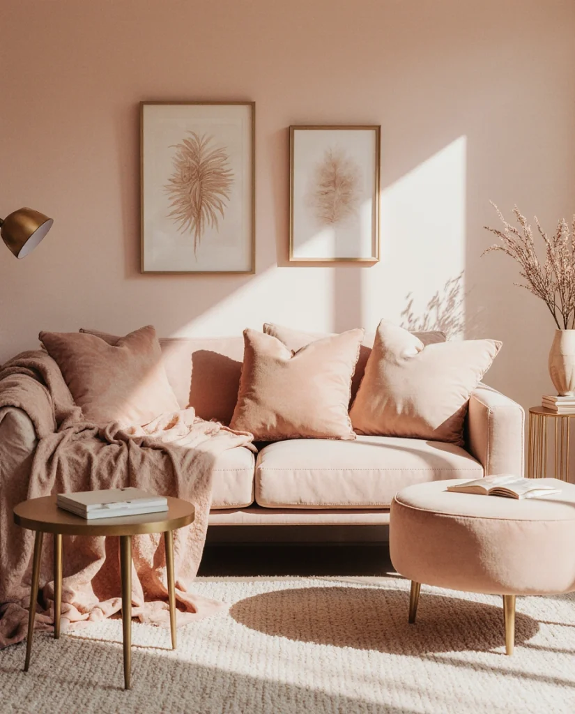 Girly cozy style in an apartment is a soft color palette with plush fabrics and gentle curves. The room has a warm feel without clutter. The space does a great job of using blush tones along with warm whites and gold accents, with small furniture pieces that are great for small spaces. Many design blogs note this small living arrangement and feminine style add softness while remaining very functional.