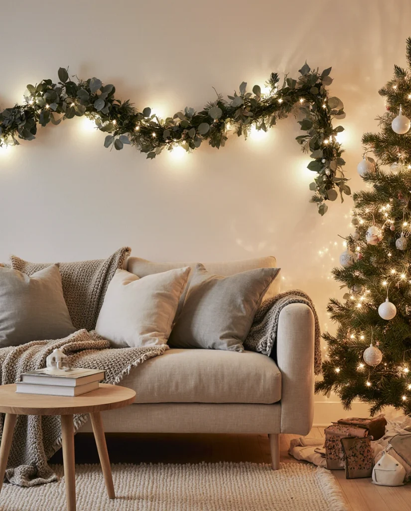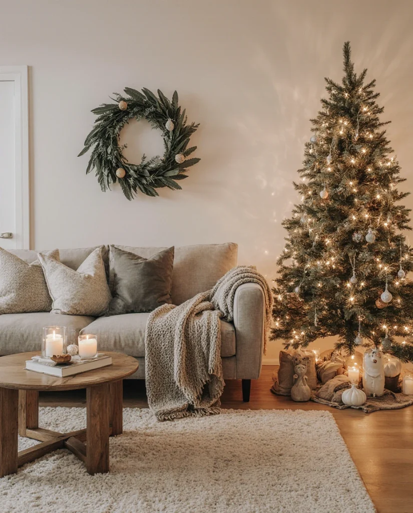 A simple Christmas look fits well with neutral palettes, especially for apartments where balance matters. Soft greenery, warm lights, and understated accents create a calm winter mood without overwhelming the room. Writers at The Spruce often praise minimal seasonal décor for maintaining coziness through the entire season, helping the space feel festive yet relaxed.