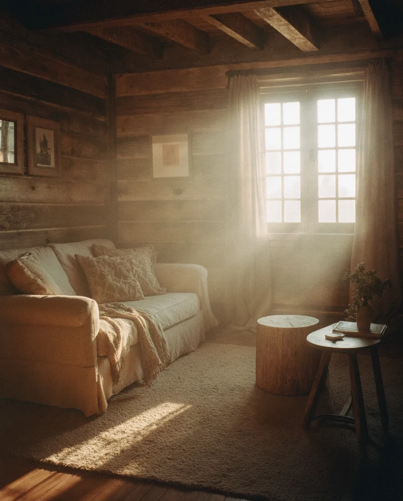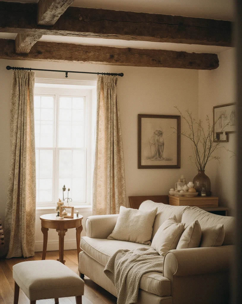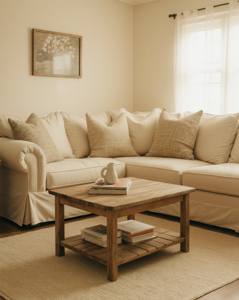 A farmhouse-style cozy room brings together warm neutrals, wooden accents, and soft fabrics. This approach works for both modern and older homes, giving the space a sense of tradition and comfort. Designers often note that farmhouse coziness appeals to families who want a warm, approachable living room with timeless charm.