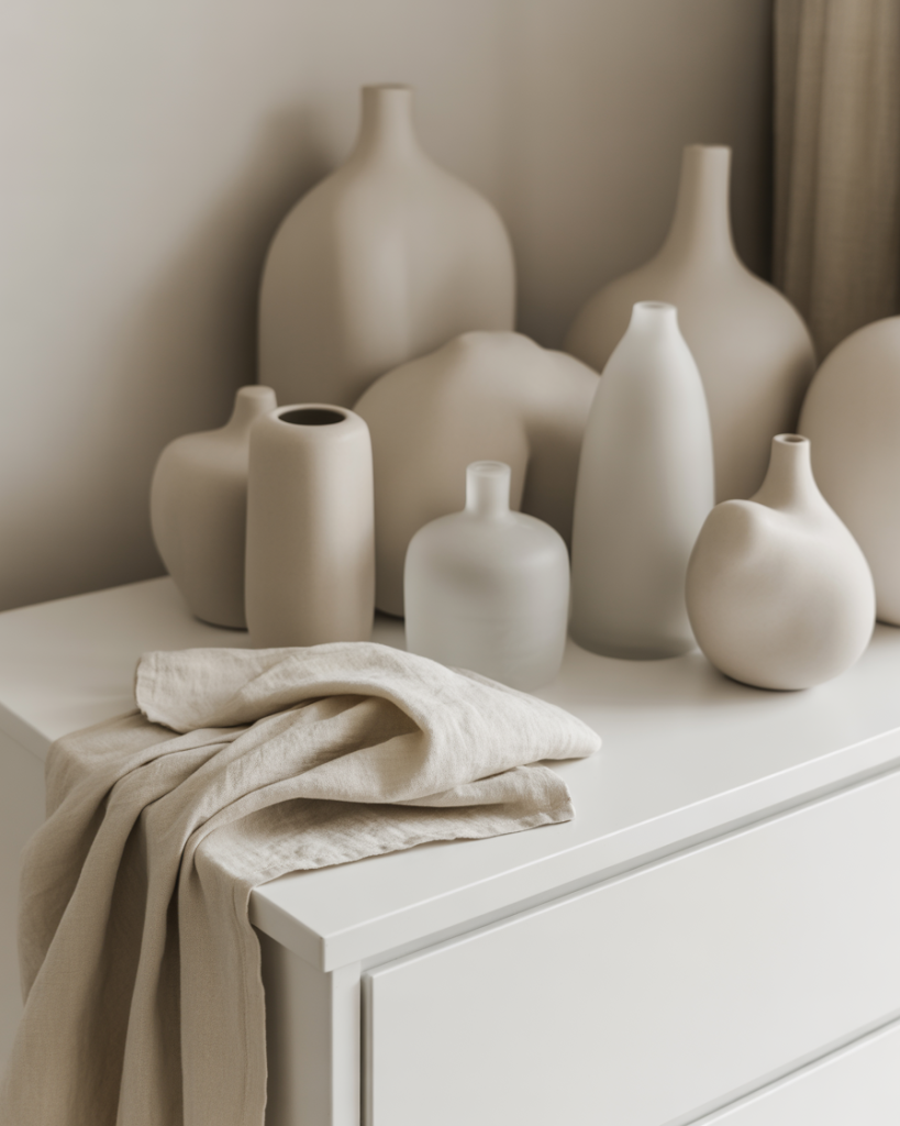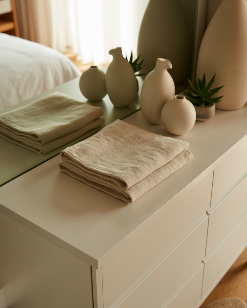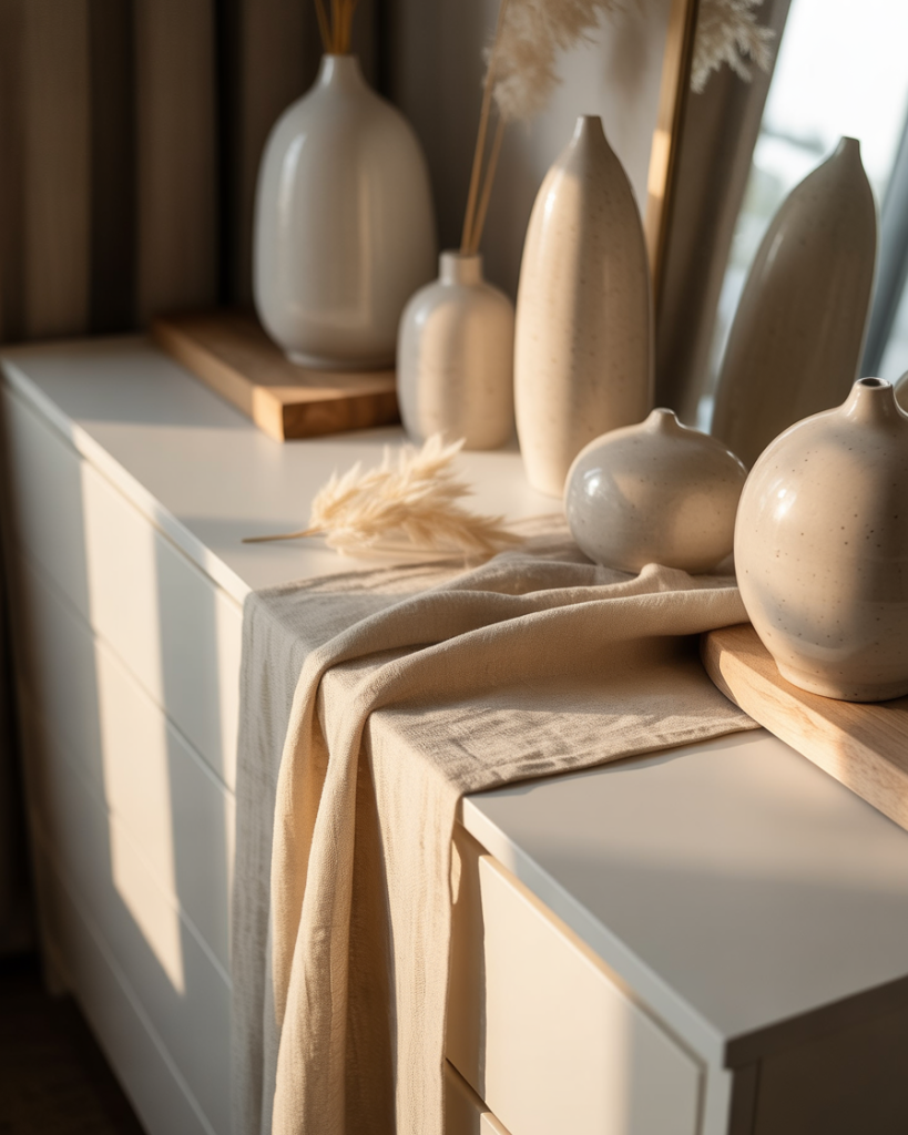 An all-white softly styled dresser arrangement strikes a balance between timeless and gallery-like. Combine some tonal depth using ceramic vases and pale decor readers with some frosted glass accessories. This approach works well in a minimalist bedroom where serenity and clear order are of primary importance. To enhance comfort, introduce one richer element using linen or bouclé.
