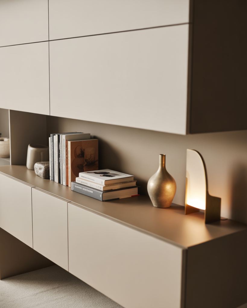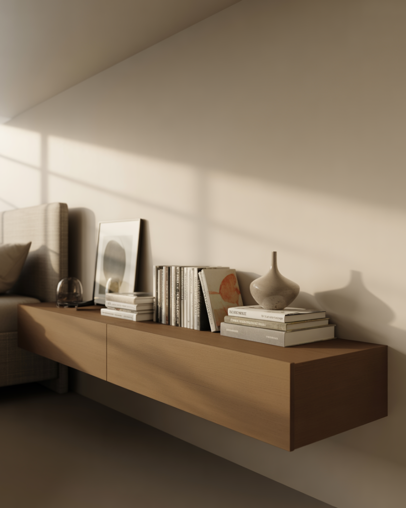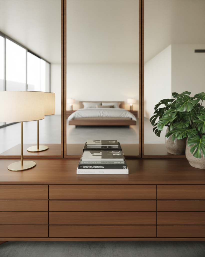 A wall-mounted dresser is perfect for a modern bedroom layout, especially in small apartments. By lifting storage off the floor, the room instantly feels bigger and cleaner. Style the top of the shelf with low décor—stacked books, soft lighting, or a single sculptural vase. Works well in minimalist spaces and pairs beautifully with a bedroom with a TV mounted because the wall stays visually open and organized.