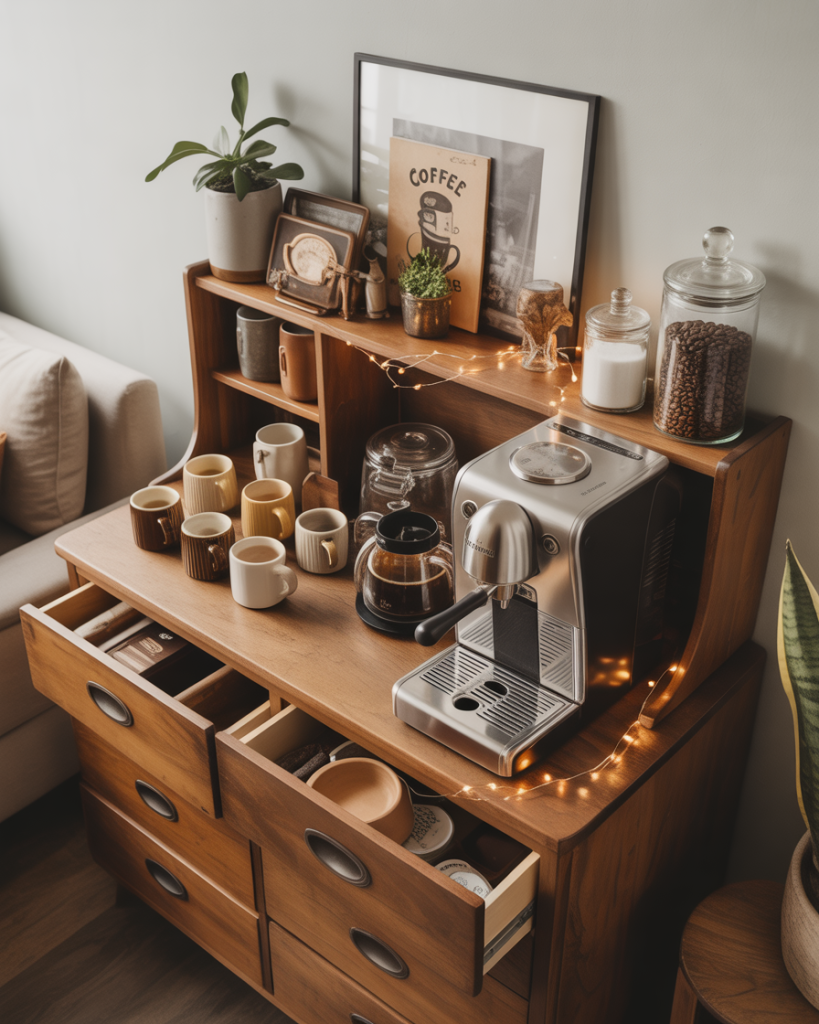 For studio layouts or a living room that doubles as a sleeping space, a dresser can become a stylish mini coffee bar. Add a tray with mugs, a small espresso machine, and jars of beans. The mix of utility and décor turns the dresser into a lifestyle hub. This works especially well with dark black or white finishes for a clean café feel.