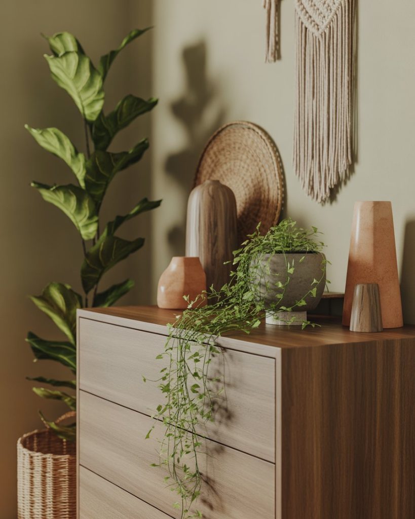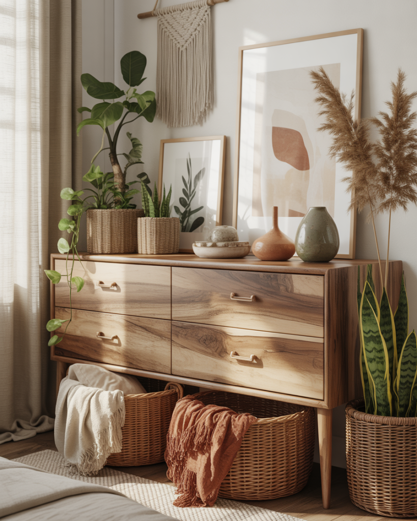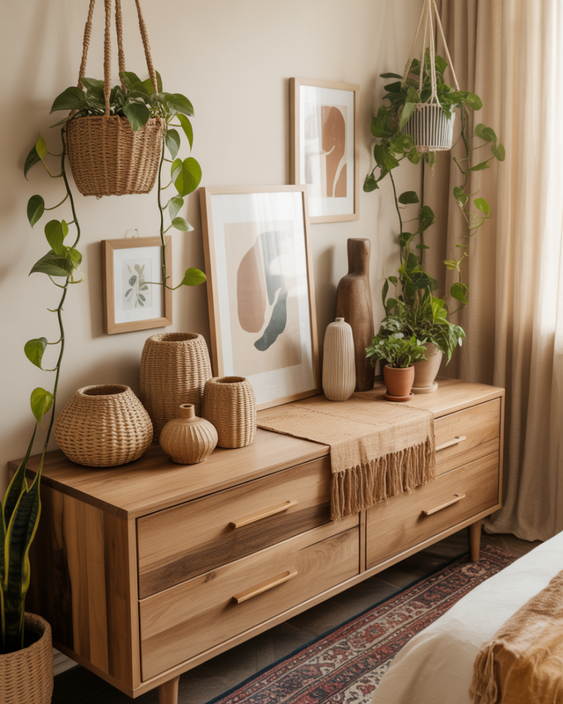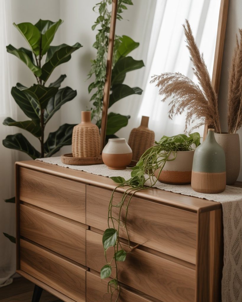 If you love plants, turn your dresser into a small jungle corner. A tall leafy plant beside it, paired with trailing vines on top, makes the dresser feel alive. This organic setup works in both boho and farmhouse spaces, adding freshness and color without effort. Great for rooms needing softness or natural energy.