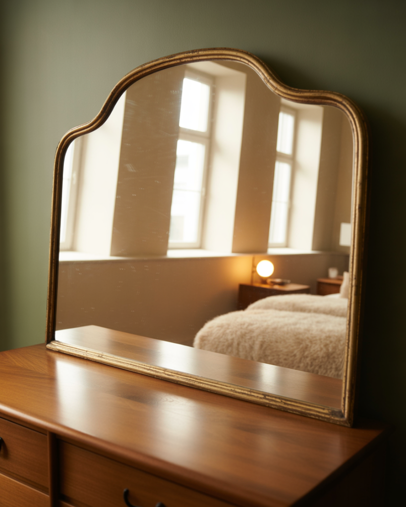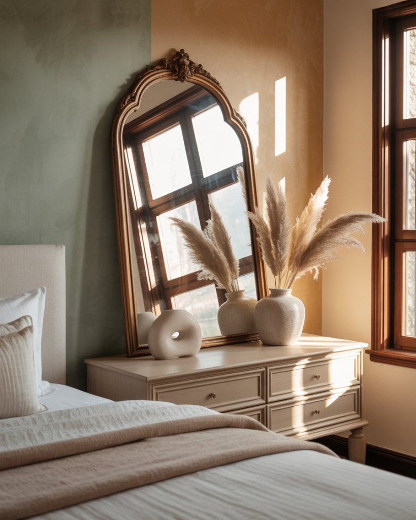 Placing a large mirror above the dresser creates instant visual height and reflects light across the bedroom. Choose arched, vintage gold, or contemporary frameless styles depending on your aesthetic. This idea doubles as décor and function, especially in tight spaces where a full vanity won’t fit.